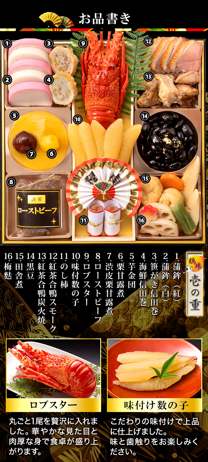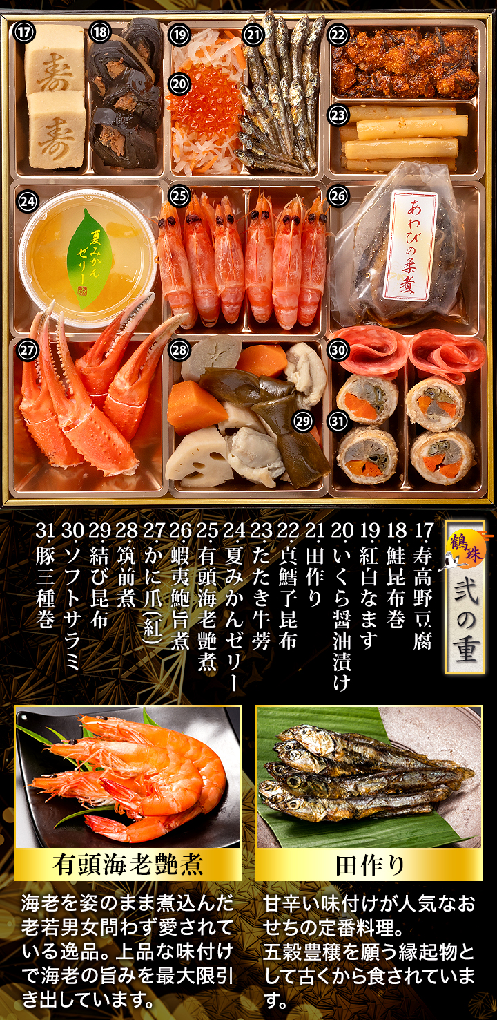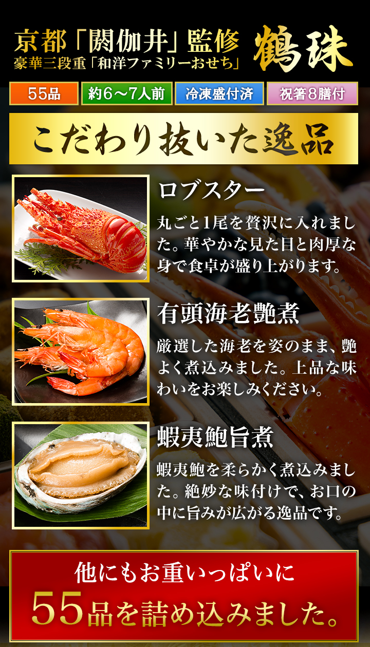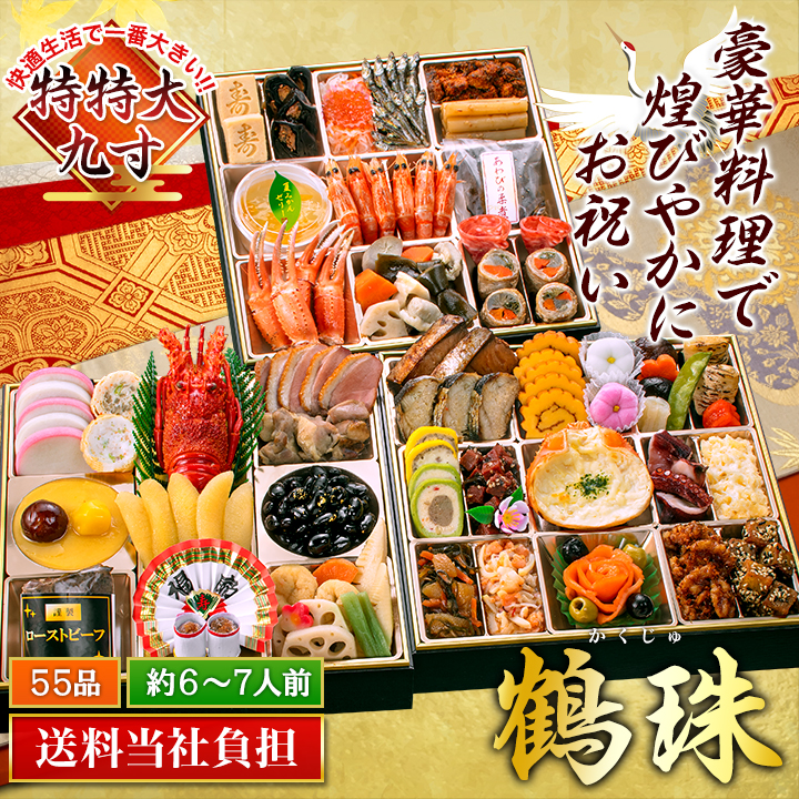 | セット内容 | 【鶴珠】55品目 約6~7人前 セット品:祝箸8膳、風呂敷、お品書き <壱の重>(計16品) 蒲鉾(紅)、蒲鉾(白)、笹がき信田巻、海鮮信田巻、芋金団、栗甘露煮、渋皮栗甘露煮、ローストビーフ、ロブスター、味付数の子、のし柿、紅茶合鴨スモーク、紅茶合鴨炭火焼、黒豆、田舎煮、梅麩 <弐の重>(計15品) 寿高野豆腐、鮭昆布巻、紅白なます、いくら醤油漬け、田作り、たたき牛蒡、真鱈子昆布、夏みかんゼリー、有頭海老艶煮、蝦夷鮑旨煮、かに爪(紅ズワイ)、筑前煮、結び昆布、ソフトサラミ、豚三種巻 <参の重>(計24品) 鰤照焼、にしん親子巻、伊達巻、花餅(紅)、花餅(白)、椎茸旨煮、梅人参、焼湯葉巻、花こんにゃく(白)、花こんにゃく(紅)、さやえんどう、合鴨テリーヌ、はかた地鶏テリーヌ、鮪昆布、かにグラタン、酢だこ、数の子サラダ、数の子松前漬け、海鮮マリネ、スモークサーモンフラワー、オリーブ、オリーブ(緑)、かつおくるみ、ごまポテト |