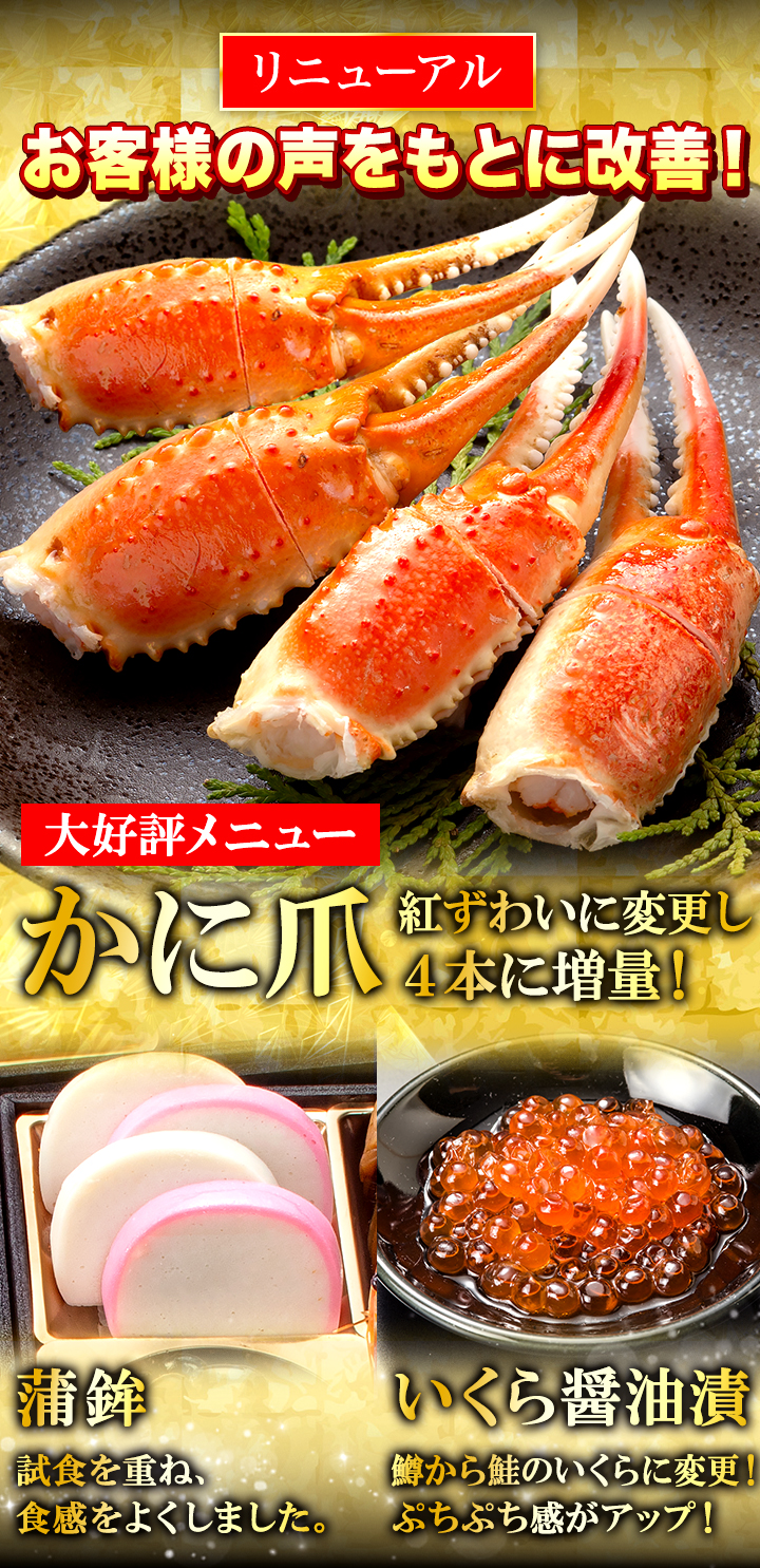 | キャンセル、返品、交換について | ※おせち料理は11月14日までキャンセル・変更を承ります。 11月15日以降はキャンセル・変更は承れませんのであらかじめご了承ください。 お届けした際に、商品に不備、送り間違いがある場合、また何らかの事故による不良が発生した場合には、大変お手数ではございますが、お電話またはメールにてご連絡ください。 |