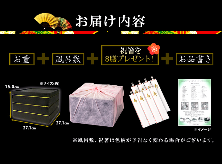 ※サイズは当社基準です。 ※風呂敷、祝箸の色、柄は変わる可能性があります。 ※写真と実際のお品書きの配置が異なる場合や、おせち商品の内容は、一部変更になる可能性があります。 ※価格、販売期間が予告なく変更する場合があります。 ※クレジットカード決済をご利用の場合は、カード承認がとれてはじめてご注文成立となります。お客様のご利用のカード締日等によっては、商品のお届け前にお引き落としになる場合がございますのでご了承ください。 ※セット内容に飾りは含まれません。 |