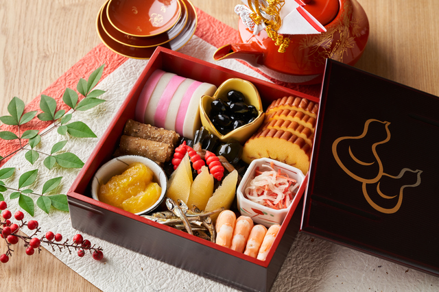 おせち料理が詰められる重箱は、それ自体がお祝いのコース料理のように構成されています。
