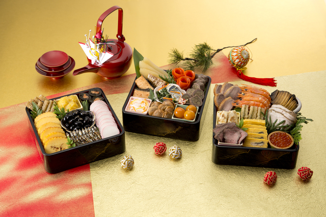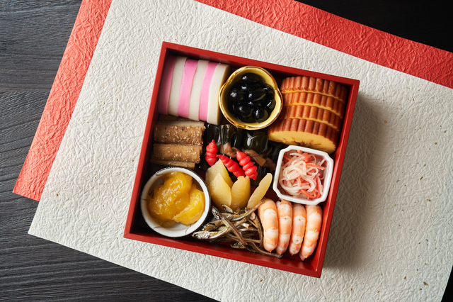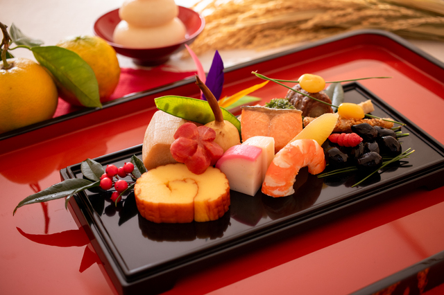 壱の重から参の重まで、日本の伝統的なお正月にふさわしい、心のこもった和の品々が美しく並びます。