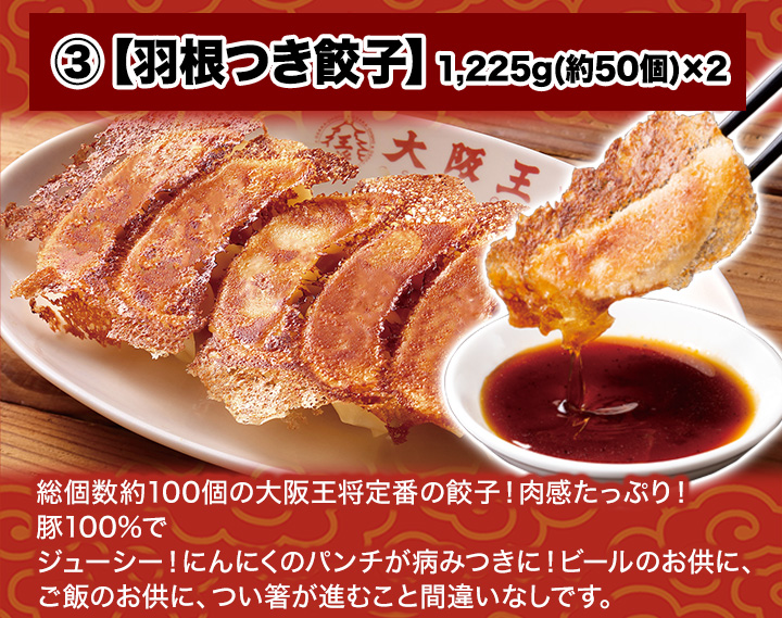 | セット内容 | とろとろ玉子の天津飯 260g×2 中華丼の具 170g×4 羽根付餃子 1,225g(約50個)×2 炒めチャーハン 200g×2 海老塩チャーハン 210g×2 若鶏から揚げ 300g×2 |