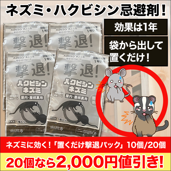 | 商品説明 | 屋内用のねずみ・ハクビシンの忌避剤です。本品を侵入経路におくだけで効果が発揮します。 役所や学校、高速道路、ホテルに森林組合、牧場などに多数納品実績の誇る特許忌避剤を元に、本品が開発されました。 |