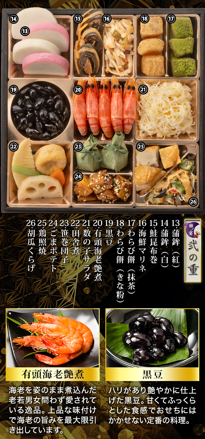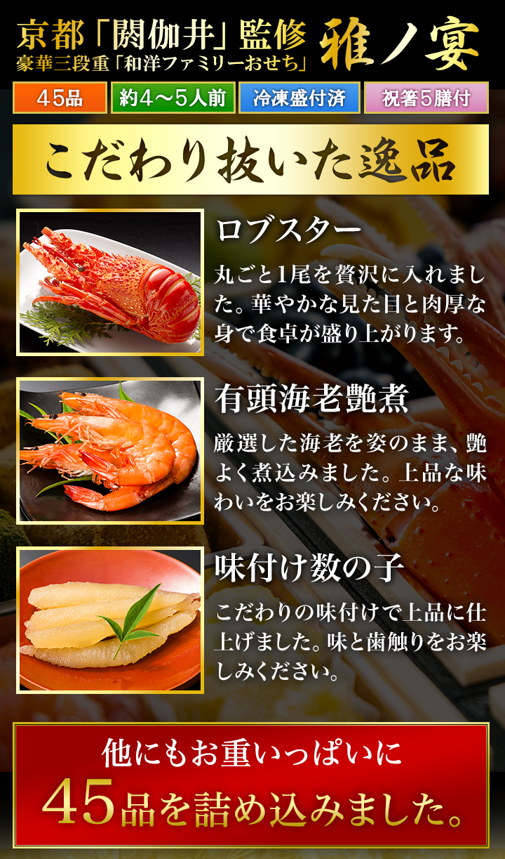 | セット内容 | 【雅ノ宴】45品目 約4~5人前 セット品:祝箸5膳、風呂敷、お品書き <壱の重>(計12品) たたき牛蒡、真鱈子昆布、鮪昆布、筑前煮、ロブスター、味付数の子、紅茶合鴨スモーク、紅茶合鴨炭火焼、芋金団、栗甘露煮、帆立明太、菊花くらくら和え <弐の重>(計14品) 蒲鉾(紅)、蒲鉾(白)、鮭昆布巻、海鮮マリネ、わらび餅(抹茶)、わらび餅(きな粉)、黒豆、有頭海老艶煮、数の子サラダ、田舎煮、笹巻団子、ごまポテト、鶏照焼、胡瓜くらげ <参の重>(計19品) 高野豆腐、椎茸旨煮、焼湯葉巻、花こんにゃく(紅)、花こんにゃく(白)、さやえんどう、伊達巻、紅白なます、いくら醤油漬け、田作り、かつおくるみ、サーモンスライス、松前漬け、椎茸しんじょ、海老しんじょ、かに爪、ハンバーグ、鰆西京焼、夏みかんゼリー |