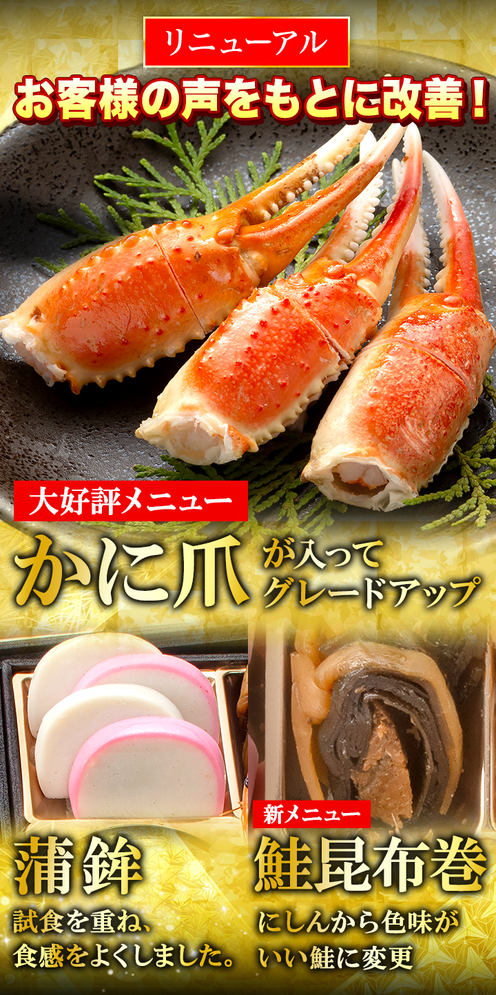 | キャンセル、返品、交換について | ※おせち料理は11月14日までキャンセル・変更を承ります。 11月15日以降はキャンセル・変更は承れませんのであらかじめご了承ください。 お届けした際に、商品に不備、送り間違いがある場合、また何らかの事故による不良が発生した場合には、大変お手数ではございますが、お電話またはメールにてご連絡ください。 |