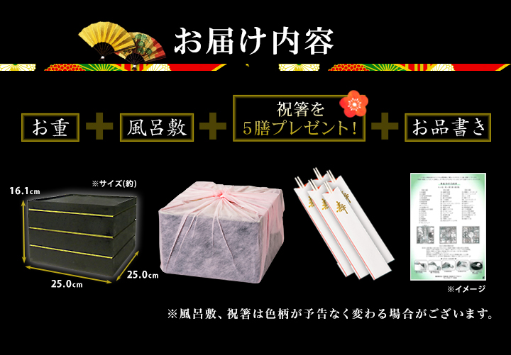 ※サイズは当社基準です。 ※風呂敷、祝箸の色、柄は変わる可能性があります。 ※写真と実際のお品書きの配置が異なる場合や、おせち商品の内容は、一部変更になる可能性があります。 ※価格、販売期間が予告なく変更する場合があります。 ※クレジットカード決済をご利用の場合は、カード承認がとれてはじめてご注文成立となります。お客様のご利用のカード締日等によっては、商品のお届け前にお引き落としになる場合がございますのでご了承ください。 ※セット内容に飾りは含まれません。 |
