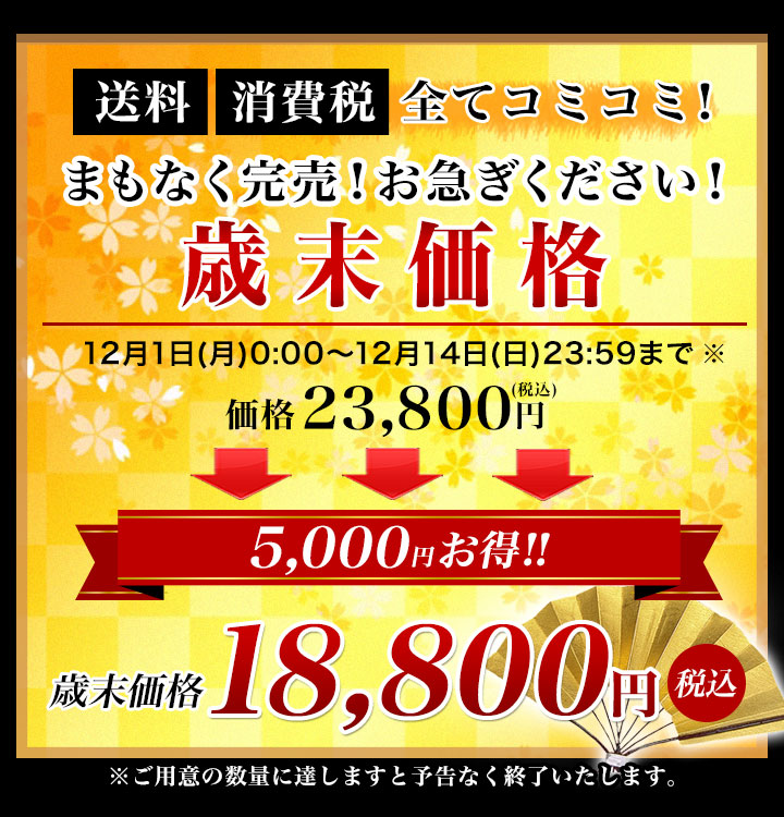 | 最終受付締切 | 【代金引換】 北海道、沖縄、離島:12月24日 上記以外:12月25日 ※代引手数料が別途330円(税込)かかります。 【クレジットカード決済】 北海道、沖縄、離島:12月24日 上記以外:12月25日 【後払い決済】 利用不可 【郵便振込/銀行振込】 利用不可 |