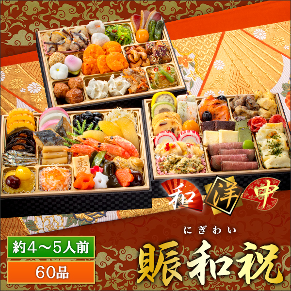 | セット内容 | 【賑和祝】60品目 約4~5人前 セット品:祝箸5膳、風呂敷、お品書き <壱の重~和~>(計25品) 伊達巻、鮭昆布巻、田作り、芋金団、渋皮栗甘露煮、栗甘露煮、蒲鉾(紅)、蒲鉾(白)、鰆西京焼、たたき牛蒡、紅白なます、いくら醤油漬け、黒豆、数の子サラダ、味付数の子、有頭海老艶煮、寿高野豆腐、花こんにゃく(紅)、花こんにゃく(白)、結び昆布、焼湯葉巻、梅人参、椎茸旨煮、梅麩、さやえんどう <弐の重~洋~>(計19品) 合鴨テリーヌ、はかた地鶏テリーヌ、かにとブロッコリーのテリーヌ、ドライフルーツパイ、杏子ラム香づけ、チーズオードブル、蓮子鯛のマリネ、ローストチキンバジル風味、スモークサーモンスライス、オリーブ、紅茶合鴨炭火焼、カジキハニーマスタード、ガトーショコラ、北海道ピュアチーズケーキ、抹茶フロマージュ、ローストビーフスライス、若桃甘露煮、ソフトサラミスライス、ロブスター入パイ焼 <参の重~中~>(計16品) 赤魚のあんかけ、海老しんじょ、小柱とわかめの中華風、紅茶合鴨スモーク、金柑甘露煮、ピリ辛胡瓜、ごま団子、花餅、桃花餅、エビチリ、カシューナッツ飴炊き、ごまポテト、黒酢肉団子、焼売、豚肉中華風炒め、貝とフカヒレ風中華 |