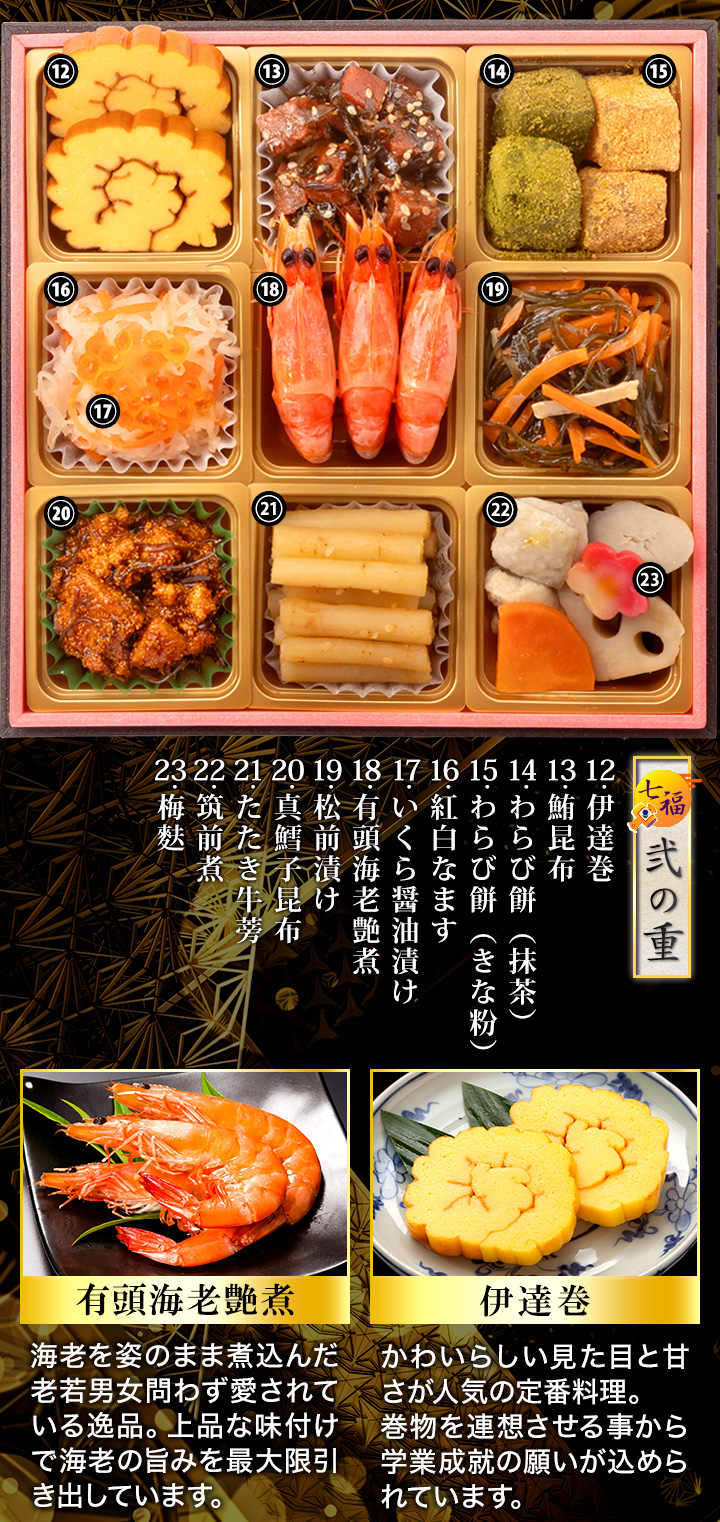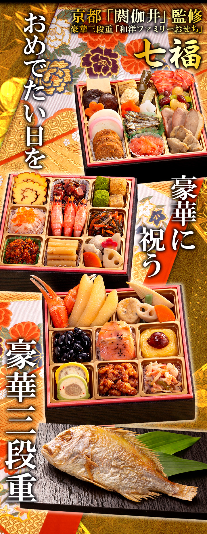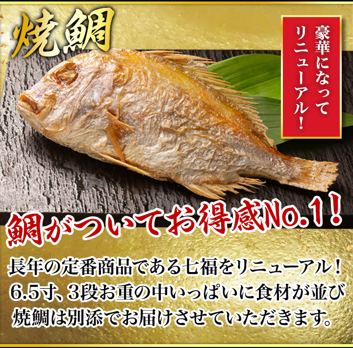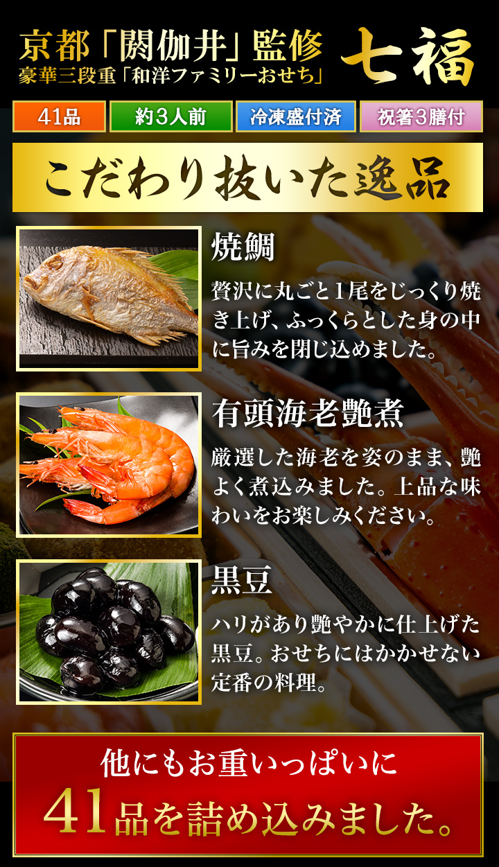 商品説明 | 鯛がついてお得感No.1! 長年の定番商品である七福がリニューアル。 6.5寸の3段お重の中いっぱいに食材が並び、焼鯛は別添でお届けさせていただきます。 新しい年の幕開けを祝うにふさわしい、京都の名店「閼伽井」監修の豪華6.5寸三段重おせちです。 約3人前、41品目と、ご家族みんなで美味しくお召し上がりいただけます。 冷凍盛付済なので、解凍後に食卓へ並べるだけ。色とりどりの食材が食卓を豪華に彩ります。 |