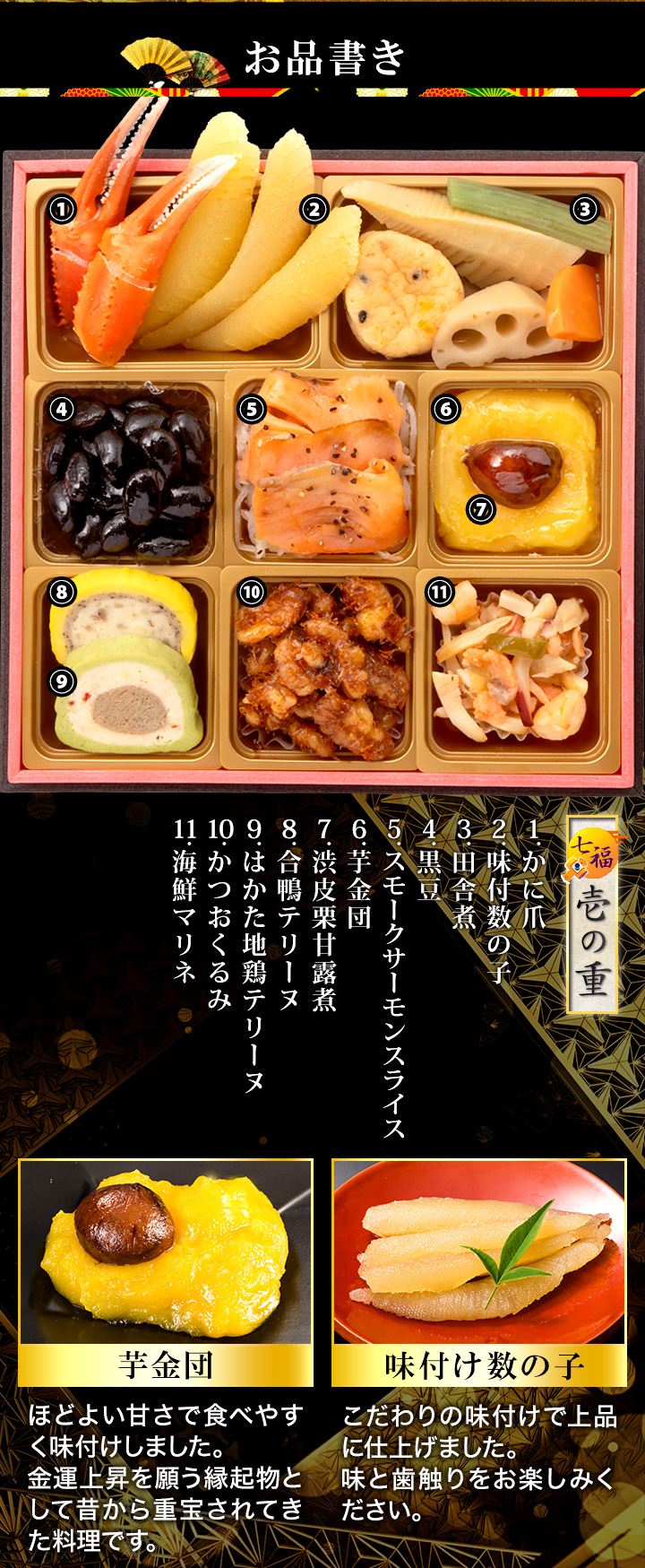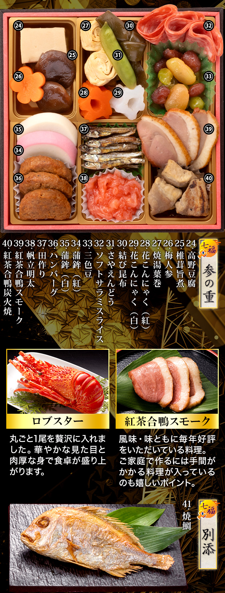 セット内容 | 【七福】41品目 約3人前 セット品:祝箸3膳、風呂敷、お品書き <壱の重>(計11品) かに爪、味付数の子、田舎煮、黒豆、スモークサーモンスライス、芋金団、渋皮栗甘露煮、合鴨テリーヌ、はかた地鶏テリーヌ、かつおくるみ、海鮮マリネ <弐の重>(計12品) 伊達巻、鮪昆布、わらび餅(抹茶)、わらび餅(きな粉)、紅白なます、いくら醤油漬け、有頭海老艶煮、松前漬け、真鱈子昆布、たたき牛蒡、筑前煮、梅麩 <参の重>(計17品) 高野豆腐、椎茸旨煮、梅人参、焼湯葉巻、花こんにゃく(紅)、花こんにゃく(白)、結び昆布、さやえんどう、ソフトサラミスライス、三色豆、蒲鉾(紅)、蒲鉾(白)、ハンバーグ、田作り、帆立明太、紅茶合鴨スモーク、紅茶合鴨炭火焼 <別添>(計1品) 焼鯛 |