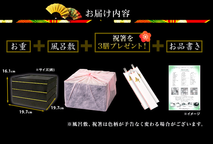 ※サイズは当社基準です。 ※風呂敷、祝箸の色、柄は変わる可能性があります。 ※写真と実際のお品書きの配置が異なる場合や、おせち商品の内容は、一部変更になる可能性があります。 ※価格、販売期間が予告なく変更する場合があります。 ※クレジットカード決済をご利用の場合は、カード承認がとれてはじめてご注文成立となります。お客様のご利用のカード締日等によっては、商品のお届け前にお引き落としになる場合がございますのでご了承ください。 ※セット内容に飾りは含まれません。 |