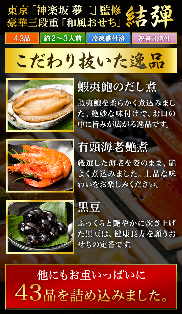 | 商品説明 | 新しい年の幕開けを祝うにふさわしい、神楽坂の名店「夢二」監修の豪華5.8寸三段重おせち! 中国産主原料、合成保存料、合成着色料不使用! 約2~3人前、43品目で、少人数でも本格的な「和」を存分にお楽しみいただけます。 冷凍盛付済なので、解凍後に食卓へ並べるだけ。色とりどりの食材が食卓を豪華に彩ります。 |