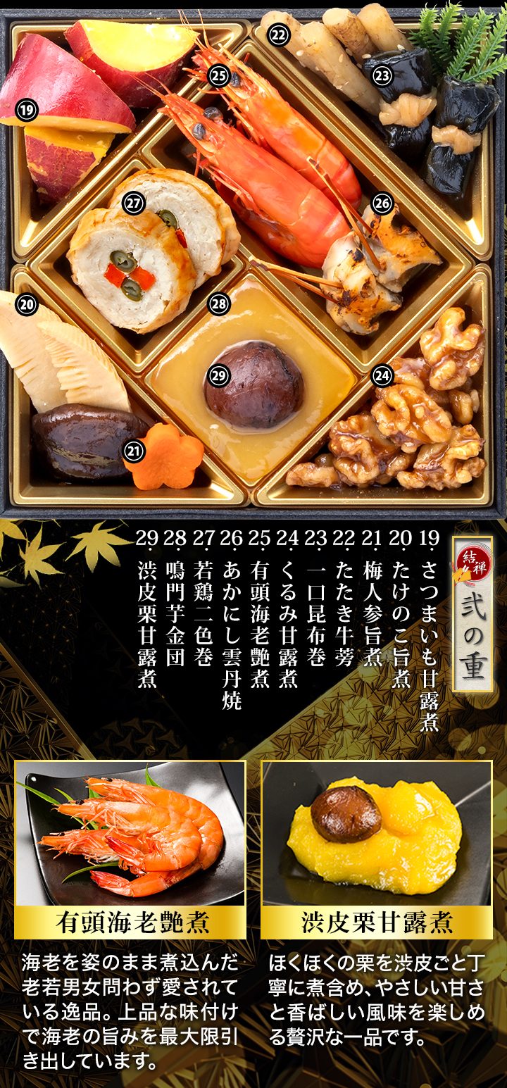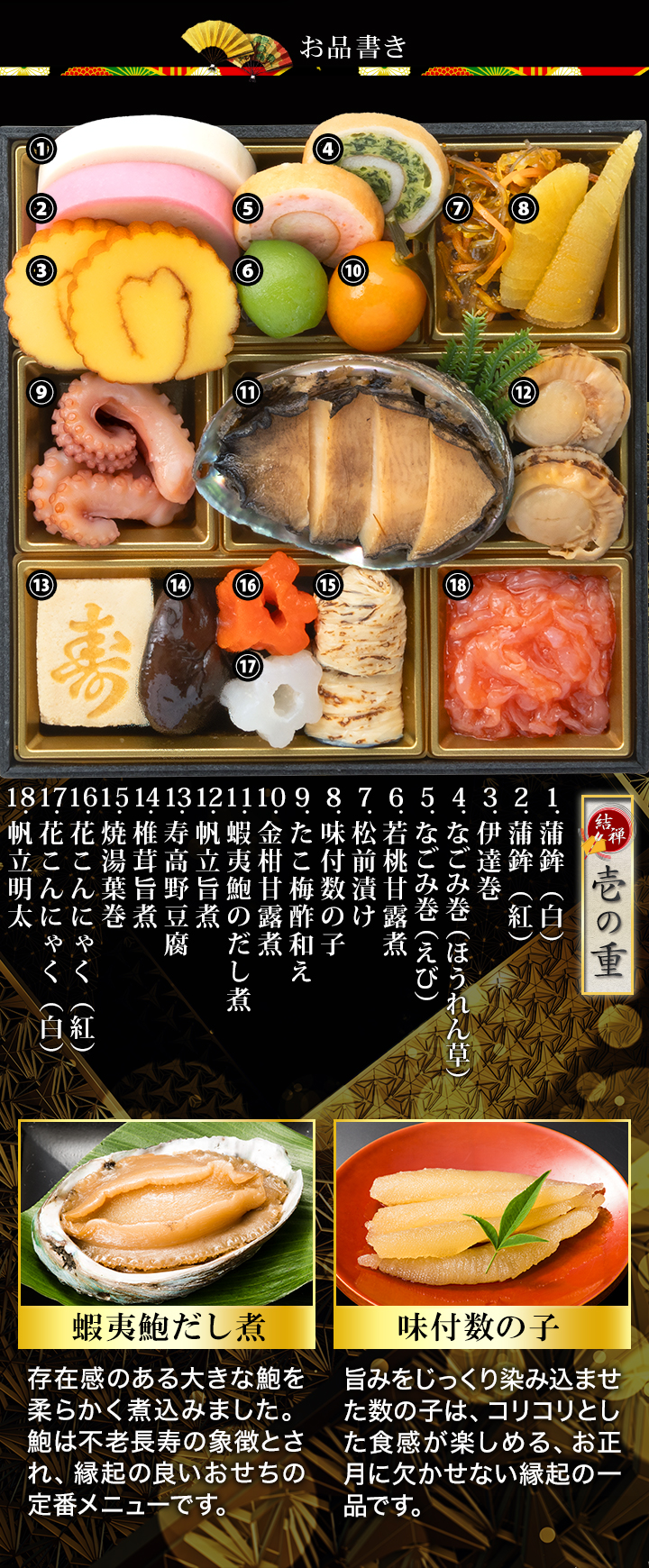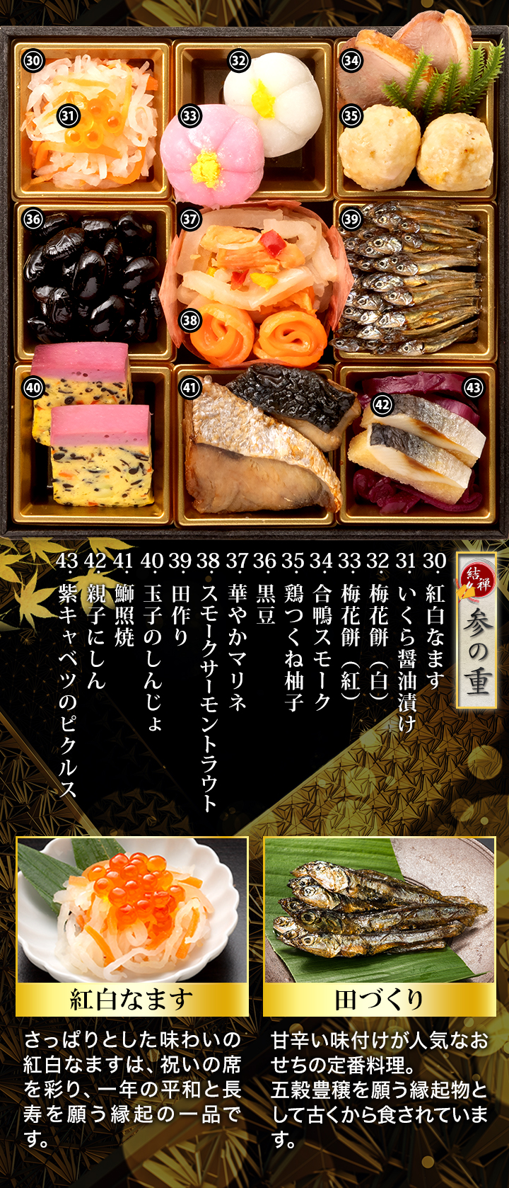 | セット内容 | 【結禅】43品目 約2~3人前 セット品:祝箸3膳、風呂敷、お品書き <壱の重>(計18品) 蒲鉾(白)、蒲鉾(紅)、伊達巻、なごみ巻(ほうれん草)、なごみ巻(えび)、若桃甘露煮、松前漬け、味付数の子、たこ梅酢和え、金柑甘露煮、蝦夷鮑のだし煮、帆立旨煮、寿高野豆腐、椎茸旨煮、焼湯葉巻、花こんにゃく(紅)、花こんにゃく(白)、帆立明太 <弐の重>(計11品) さつまいも甘露煮、たけのこ旨煮、椎茸旨煮、梅人参旨煮、たたき牛蒡、一口昆布巻、くるみ甘露煮、有頭海老艶煮、あかにし雲丹焼、若鶏二色巻、鳴門芋金団、渋皮栗甘露煮 <参の重>(計14品) 紅白なます、いくら醤油漬け、梅花餅(白)、梅花餅(紅)、合鴨スモーク、鶏つくね柚子、黒豆、華やかマリネ、スモークサーモントラウト、田作り、玉子のしんじょ、鰤照焼、親子にしん、紫キャベツのピクルス |
