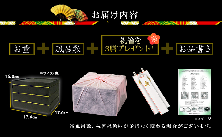 ※風呂敷、祝箸の色、柄は変わる可能性があります。 ※写真と実際のお品書きの配置が異なる場合や、おせち商品の内容は、一部変更になる可能性があります。 ※価格、販売期間が予告なく変更する場合があります。 ※クレジットカード決済をご利用の場合は、カード承認がとれてはじめてご注文成立となります。お客様のご利用のカード締日等によっては、商品のお届け前にお引き落としになる場合がございますのでご了承ください。 ※セット内容に飾りは含まれません。 |