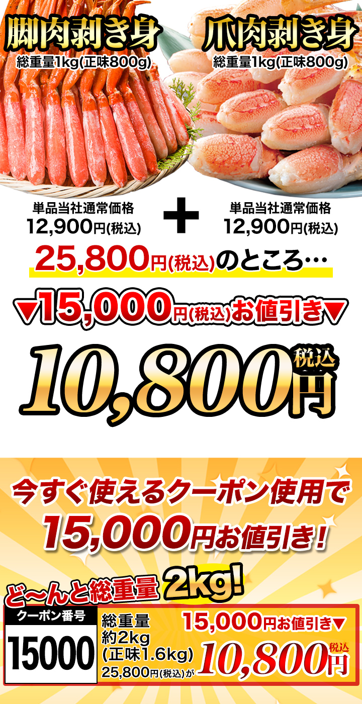 ボイル本ズワイガニ脚剥き身と爪剥き身セット 総重量:約2kg(正味1.6kg)