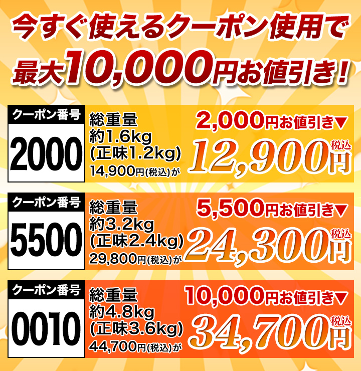 | 送料 | 総重量:約1.6kg 【全国(右記以外)】1,200円(税込) 【北海道・沖縄・離島】1,750円(税込) 総重量:約3.2kg/総重量:約4.8kg 【全国(右記以外)】送料当社負担 【北海道・沖縄・離島】660円(税込) |