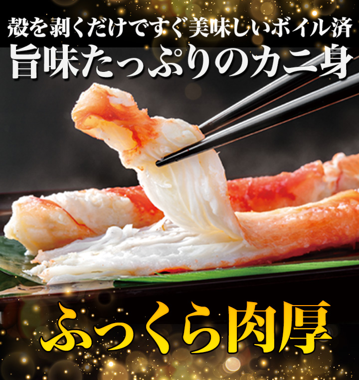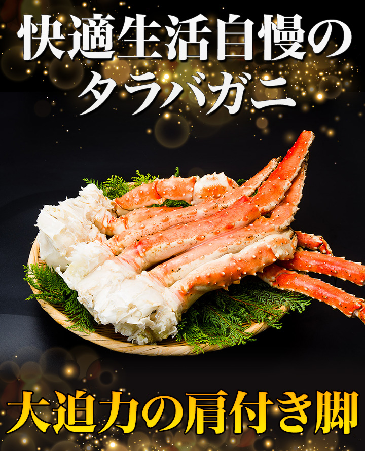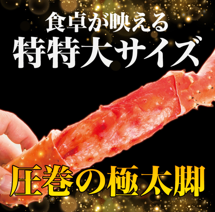 商品説明 | 思わず笑みがこぼれるほどの驚きの大きさ!特特大サイズのタラバガニ! 身入りパンパンの特特大ごんぶとの脚! タラバガニの魅力は何といっても濃厚な旨味とボリューム。 はちきれんばかりに身が詰まった極太の脚にガブリとかぶりつけば、 ジューシーな甘みが広がって食べ応え満点です。 漁獲量が激減しているタラバガニのこのサイズは貴重です。 ボイル済みなので、解凍するだけで食べられます。 焼きガニにしても美味しくお召し上がりいただけます。 ブルンブルンの肉厚と食べ応え満点のもっちり食感のカニの王様を、 口いっぱいに頬張る幸せを味わってください。 |