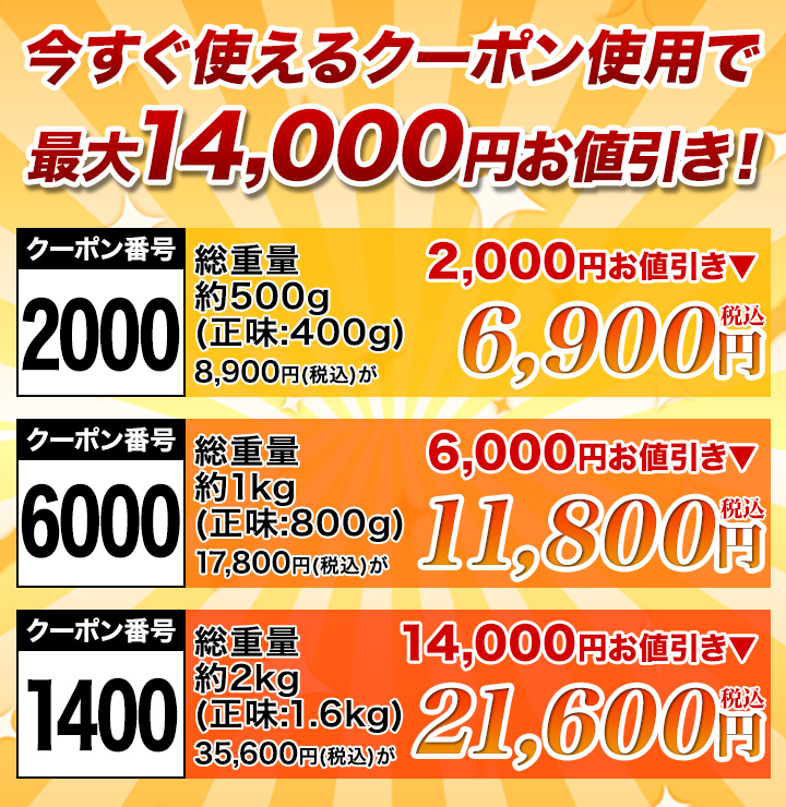 | 送料 | 総重量:約500g(正味:400g)/総重量:約1kg(正味:800g) 【全国(右記以外)】1,200円(税込) 【北海道・沖縄・離島】1,750円(税込) 総重量:約2kg(正味:1.6kg) 【全国(右記以外)】送料当社負担 【北海道・沖縄・離島】660円(税込) |