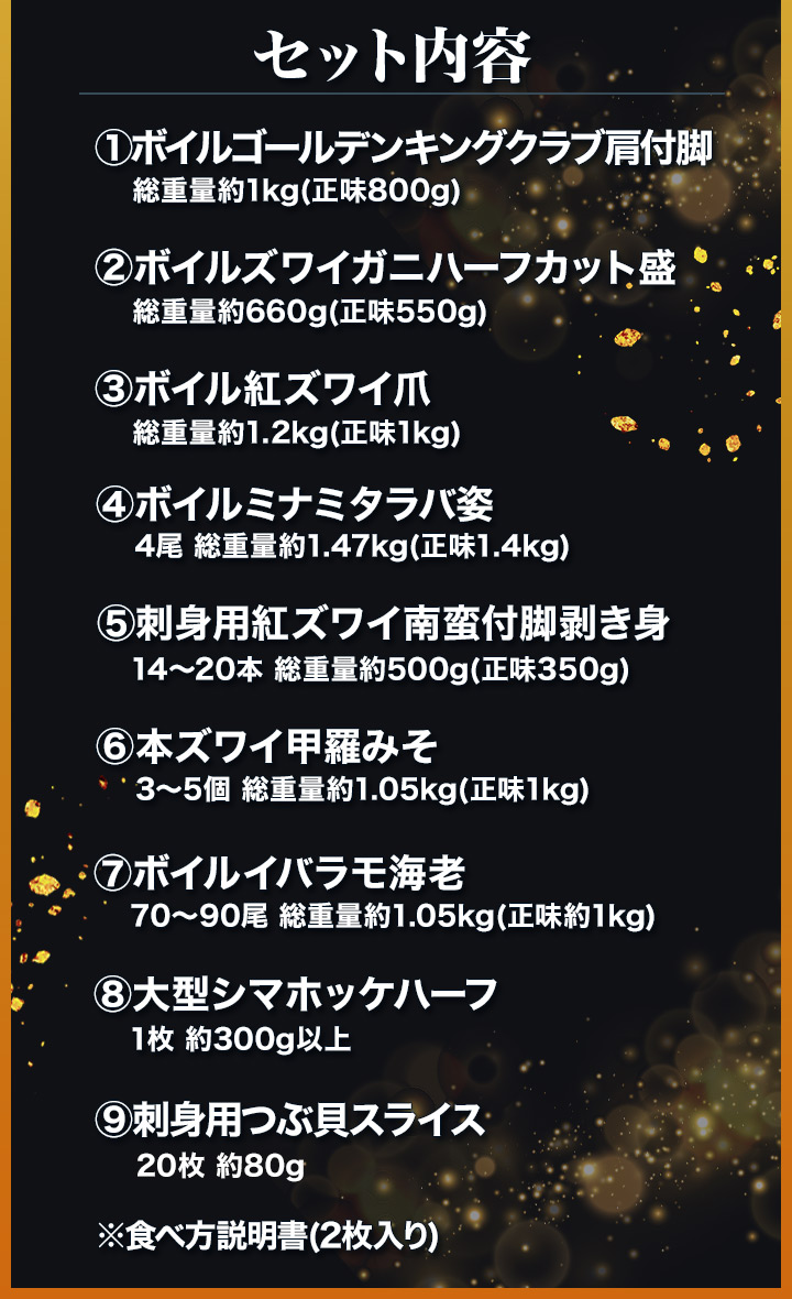 | セット内容 | 【1】ボイルゴールデンキングクラブ肩付脚 1肩 総重量約1kg(正味800g) 【2】ボイルズワイガニハーフカット盛 総重量約660g(正味550g) 【3】ボイル紅ズワイ爪 総重量約1.2kg(正味1kg):合計約26~50個 【4】ボイルミナミタラバ姿 2尾 総重量約1.47kg(正味1.4kg) ※タラバ系のため、甲羅の中にミソは入っていません。 【5】刺身用紅ズワイ南蛮付き脚剥き身 総重量500g(正味350g):合計約14~20本 【6】本ズワイ甲羅みそ 3~5個 総重量約1.05kg(正味1kg) 【7】ボイルイバラモ海老 70~90尾 総重量約1.05kg(正味1kg) 【8】大型縞ホッケハーフ 1枚 約300g以上 【9】刺身用つぶ貝スライス 20枚 約80g ※食べ方説明書(2枚入り) |
