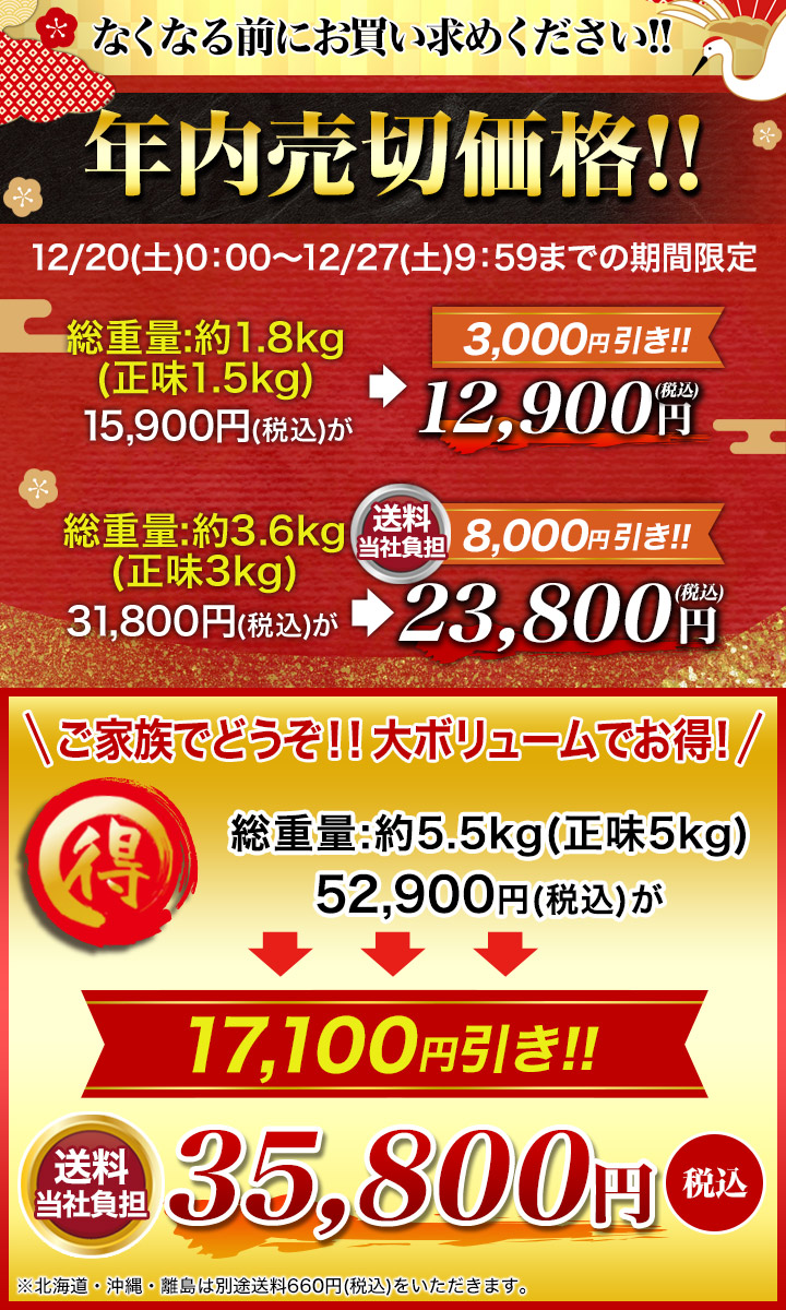 | 備考 | 総重量とは、グレーズ(氷)を含む重量です。 グレーズとは、空気に触れることによる乾燥や酸化を防ぐための氷の被膜です。 ( )内の正味とは、グレーズを除いたカニのみの重量です。 商品のラベルにはカニ正味の重量を記載しています。 折れを含みます。 |