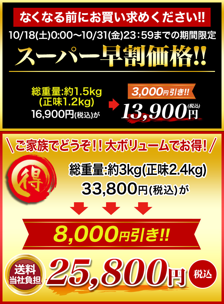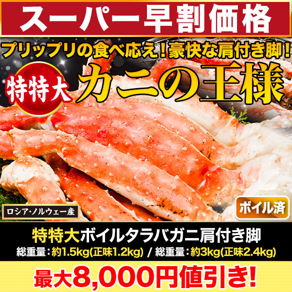 【スーパー早割価格】特特大ボイルタラバガニ肩付き脚 総重量:約1.5kg(正味1.2kg)/総重量:約3kg(正味2.4kg)