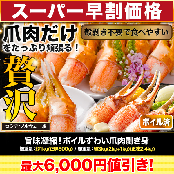 【スーパー早割価格】旨味凝縮!ボイルずわい爪肉剥き身 総重量:約1kg(正味800g)/総重量:約3kg(2kg+1kg)(正味2.4kg)