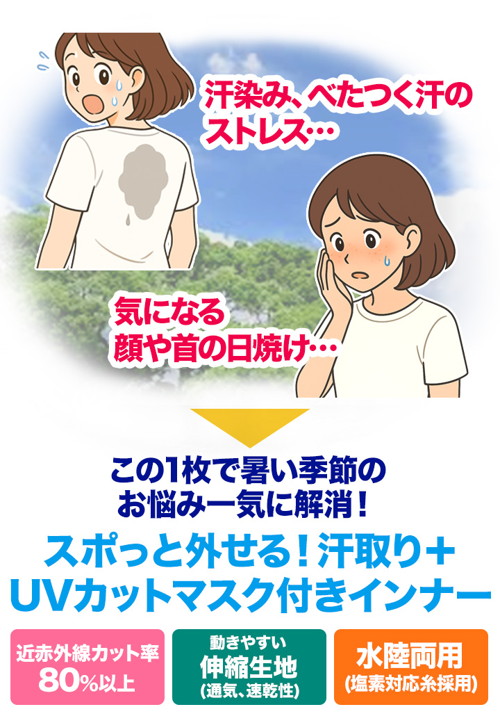 商品説明 汗染みと顔周りの日焼け…暑い季節のお悩みをこの一枚で一気に解決!