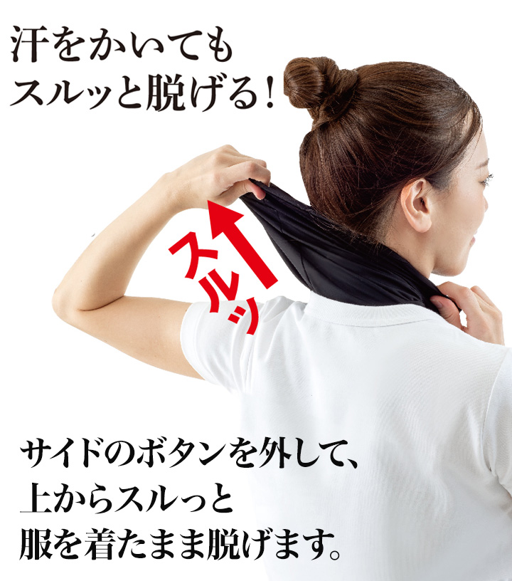サイドのボタンを外して、服の上から簡単に脱ぐことができます。