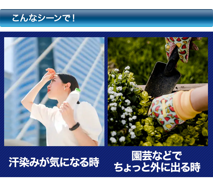 汗染みが気になるときや、園芸などでちょっと外に出るとき、屋外のスポーツなどに重宝すること間違いなしです。