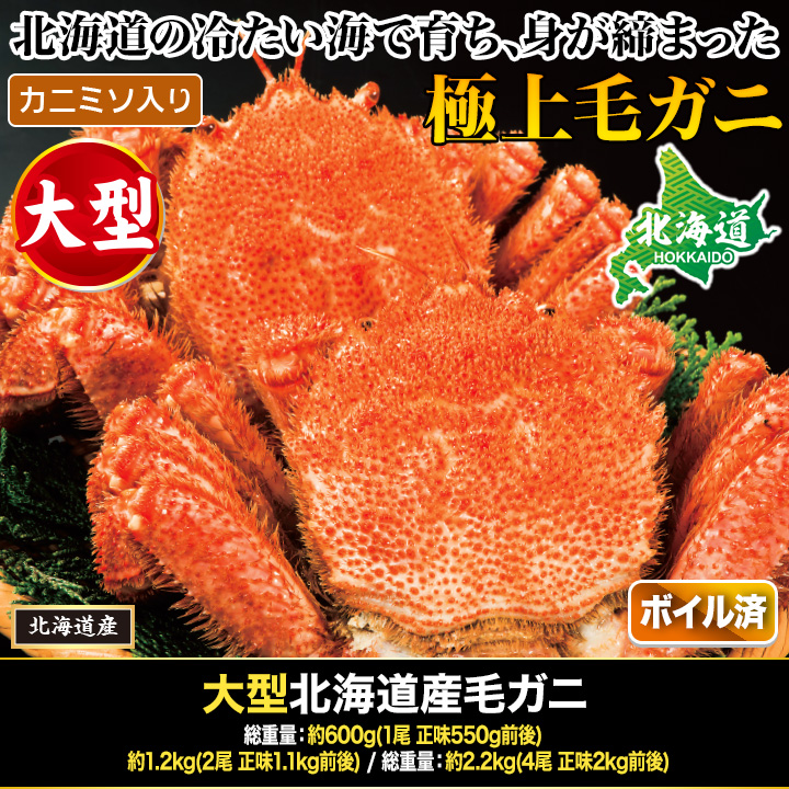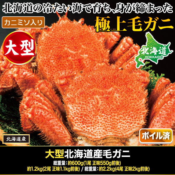 商品説明 | 北海道の冷たい海で育ち、身が締まった旨味抜群の極上毛ガニ! ぎっしり身が詰まり、たっぷりの味噌が入った最高級品で身が詰まって旨み抜群です! 北海道で水揚げされた毛ガニは3~5月に旬の時期を迎え、ぎっしり身が詰まり、たっぷりの味噌が入った最高級品です。 |