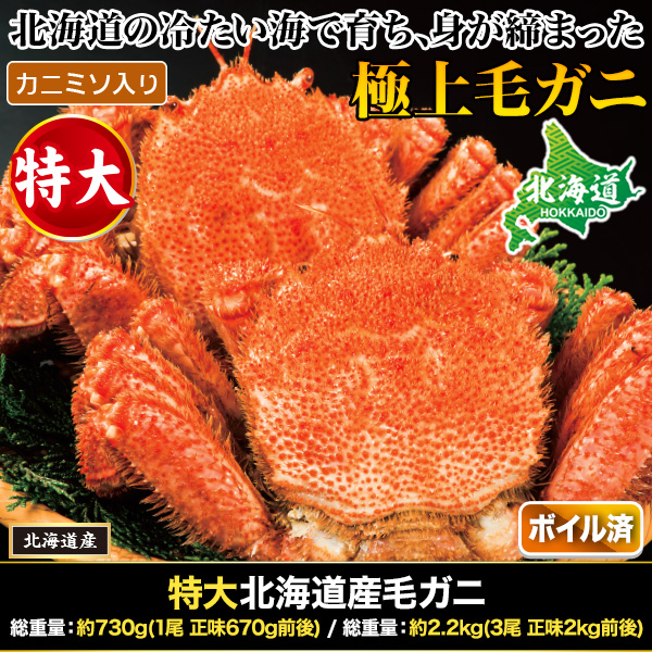 商品説明 | 北海道の冷たい海で育ち、身が締まった旨味抜群の極上毛ガニ! ぎっしり身が詰まり、たっぷりの味噌が入った最高級品で身が詰まって旨み抜群です! 北海道で水揚げされた毛ガニは3~5月に旬の時期を迎え、ぎっしり身が詰まり、たっぷりの味噌が入った最高級品です。 |