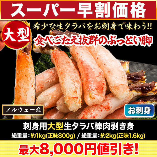 【スーパー早割価格】刺身用大型生タラバ棒肉剥き身 総重量:約1kg(正味800g)/総重量:約2kg(正味1.6kg)