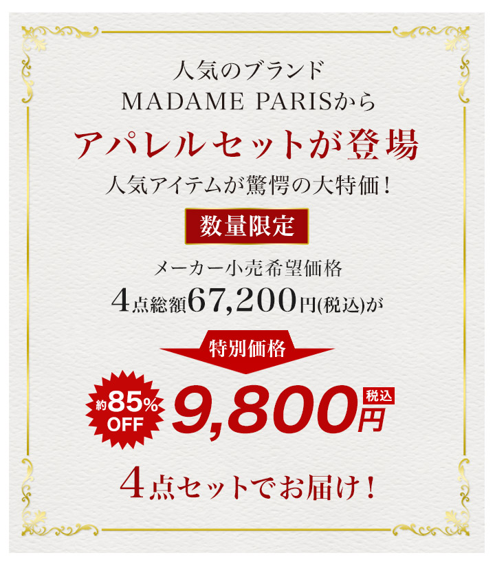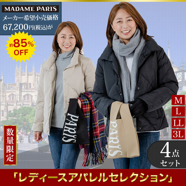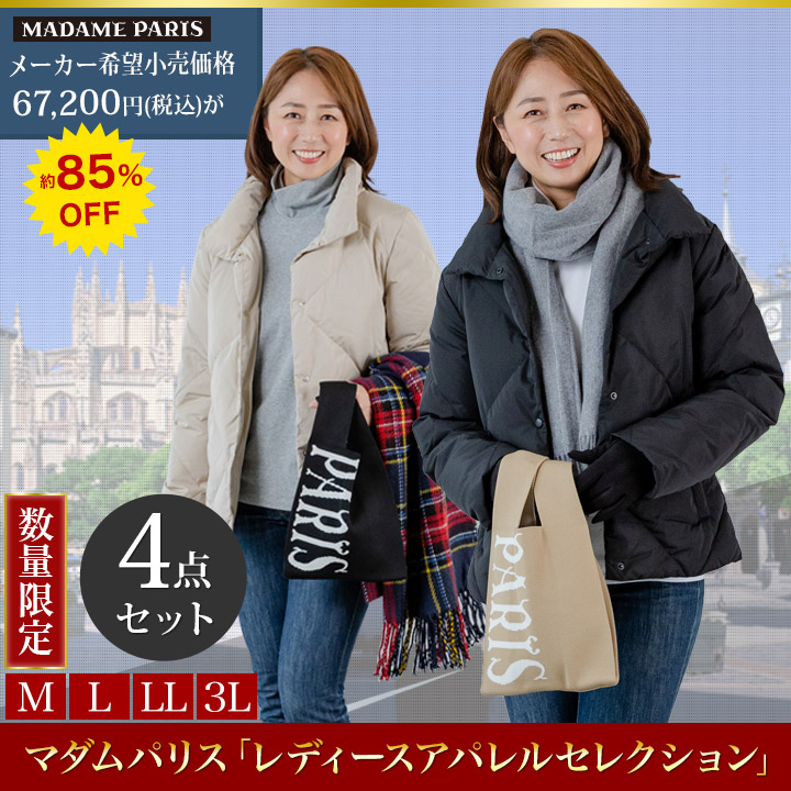 | 商品説明 | MADAME PARIS(マダム パリス)ブランドの福袋です。 とても軽く、着心地も抜群!保温性に優れたショート丈ダウン、リボンの飾りがワンポイントの手袋、おしゃれなジャガードニットバッグ、寒さ対策から季節の変わり目まで幅広く活躍するマフラーまたはストールの4点セットです。 メーカー希望小売価格総額67,200円(税込)の4点セットを約85%OFFの大特価でお届けします。 |