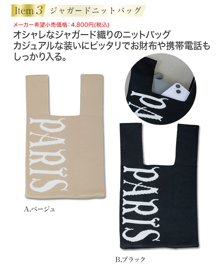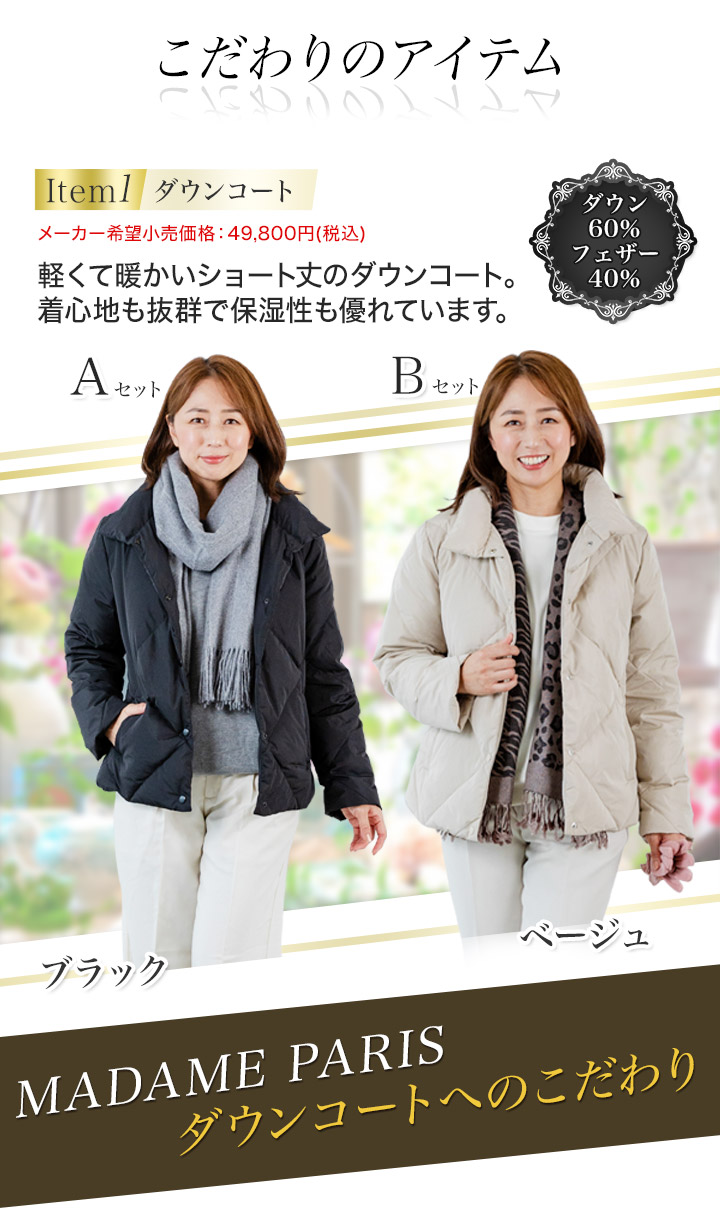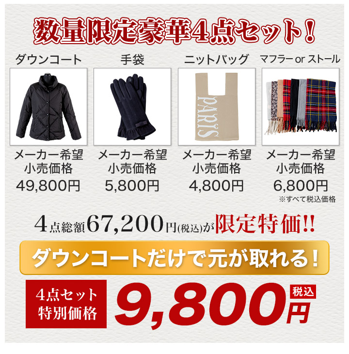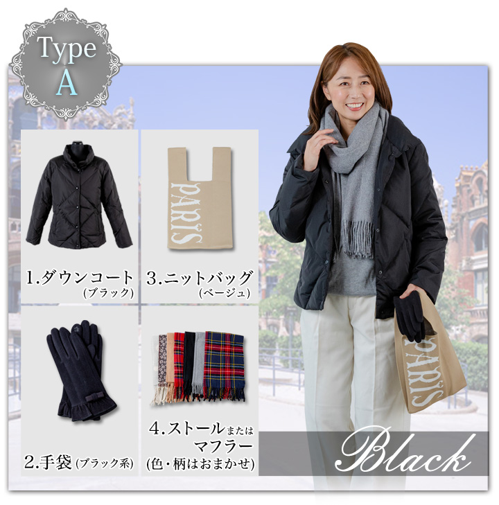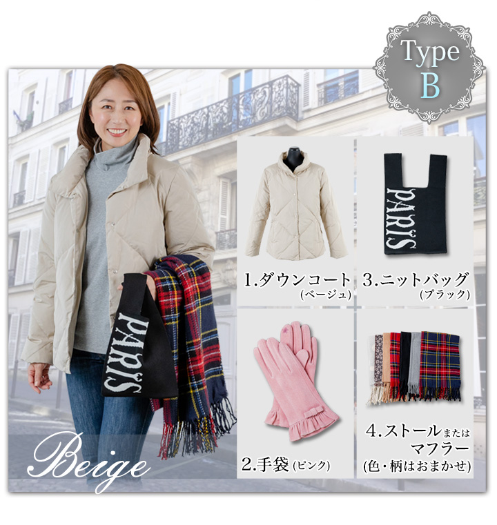 | セット内容 | 【Aセット】 ダウンコート(ブラック)、手袋(ブラック)、ジャガードニットバッグ(ベージュ)、マフラーまたはストール(色・柄はおまかせ) 【Bセット】 ダウンコート(ベージュ)、手袋(ピンク)、ジャガードニットバッグ(ブラック)、マフラーまたはストール(色・柄はおまかせ) |