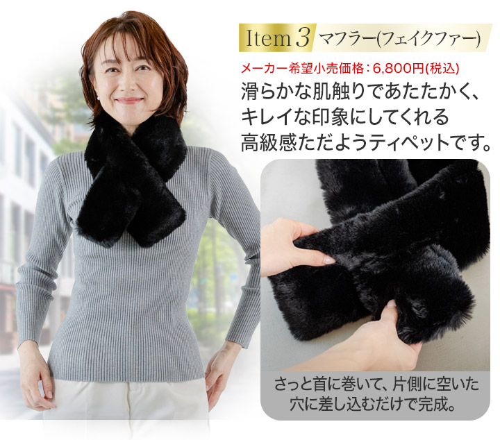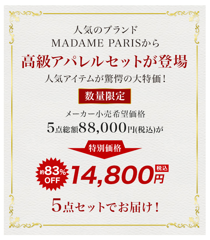 | 商品説明 | MADAME PARIS(マダム パリス)ブランドの高級アパレル5点セット! 軽くて暖かいロング丈ダウンコート、肌触りがよく着まわしやすいリブニットソー、顔周りが一気に華やかになるフェイクファーマフラー、手の甲と手のひらで異なる素材がお洒落な手袋、PARISロゴが印象的なトレンドのジャガードニットバッグの5点セットです。 メーカー希望小売価格総額88,000円(税込)の5点セットを約83%OFFの大特価でお届けします。 |