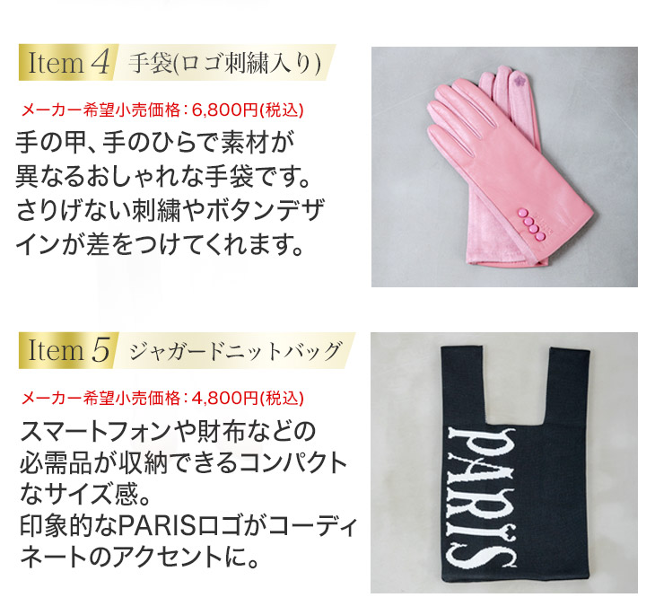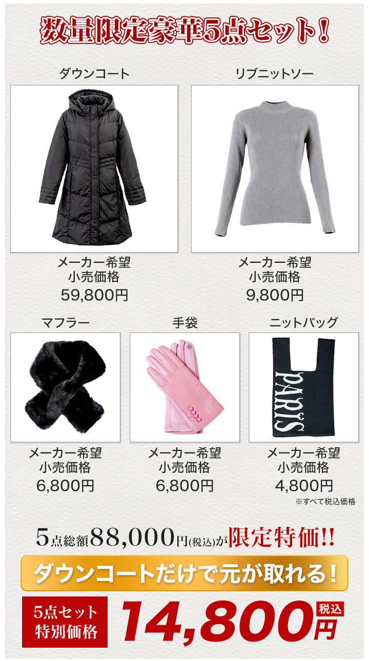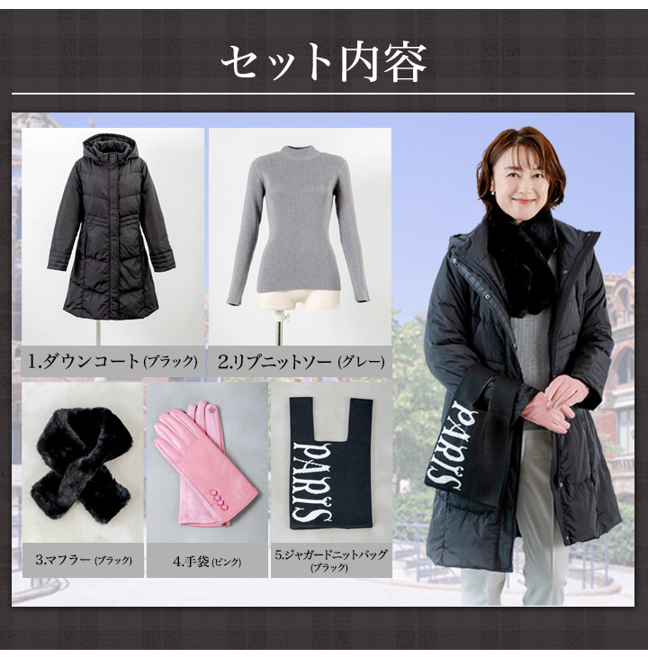 | セット内容 | 【Aセット】 ダウンコート(ブラック)、リブニットソー(グレー)、マフラー(ブラック)、手袋(ピンク)、ジャガードニットバッグ(ブラック) 【Bセット】 ダウンコート(ベージュ)、リブニットソー(ピンク)、マフラー(ベージュ)、手袋(ベージュ)、ジャガードニットバッグ(ベージュ) |
