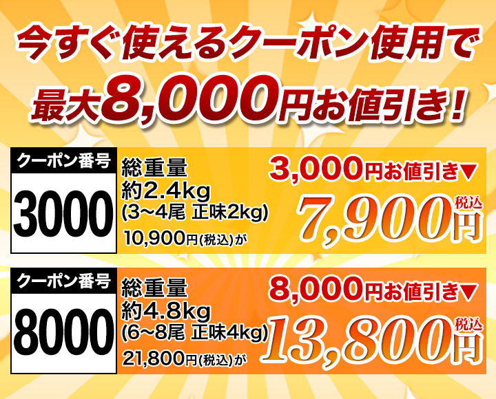 | セット内容 | 1尾:約450g~670g前後 総重量:約2.4kg(3~4尾 正味約2kg) 総重量:約4.8kg(6~8尾 正味約4kg) ※総重量でのお届けとなる為、尾数は目安となります。 |