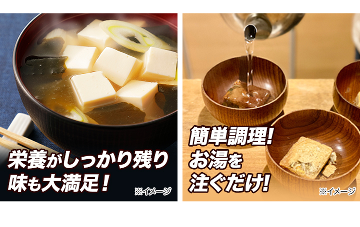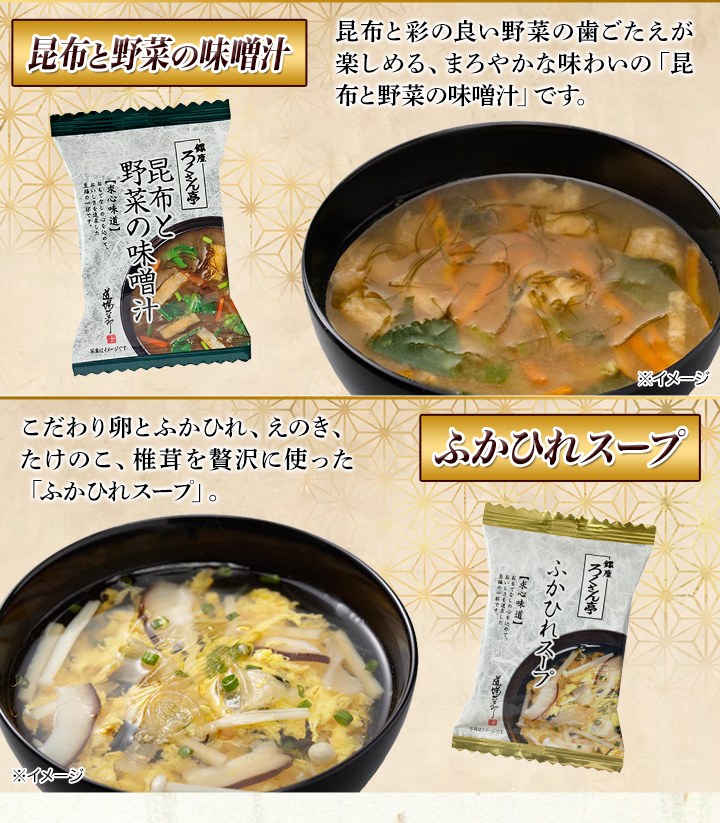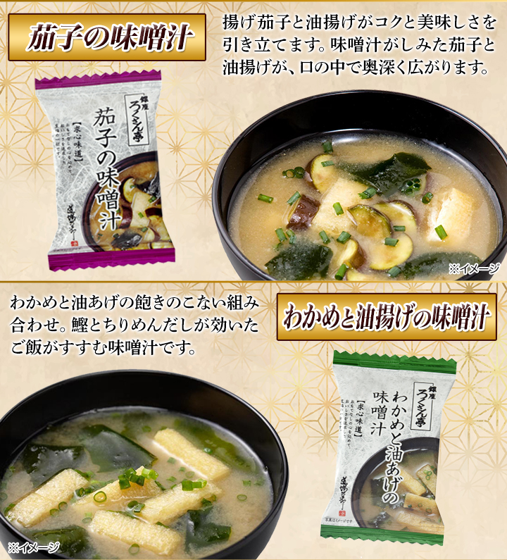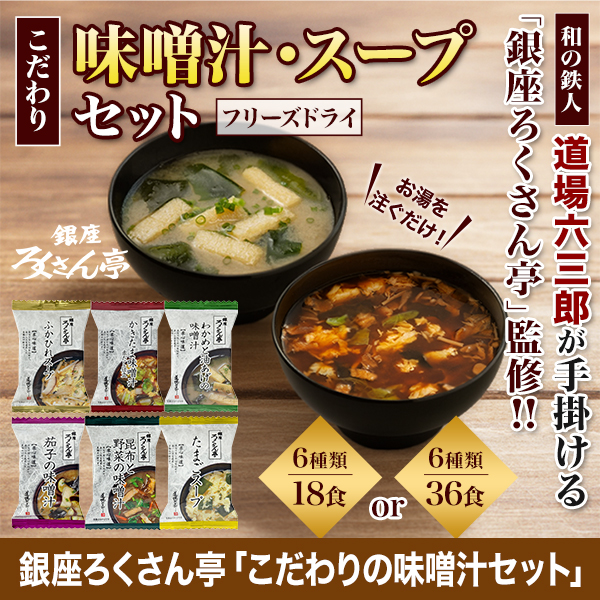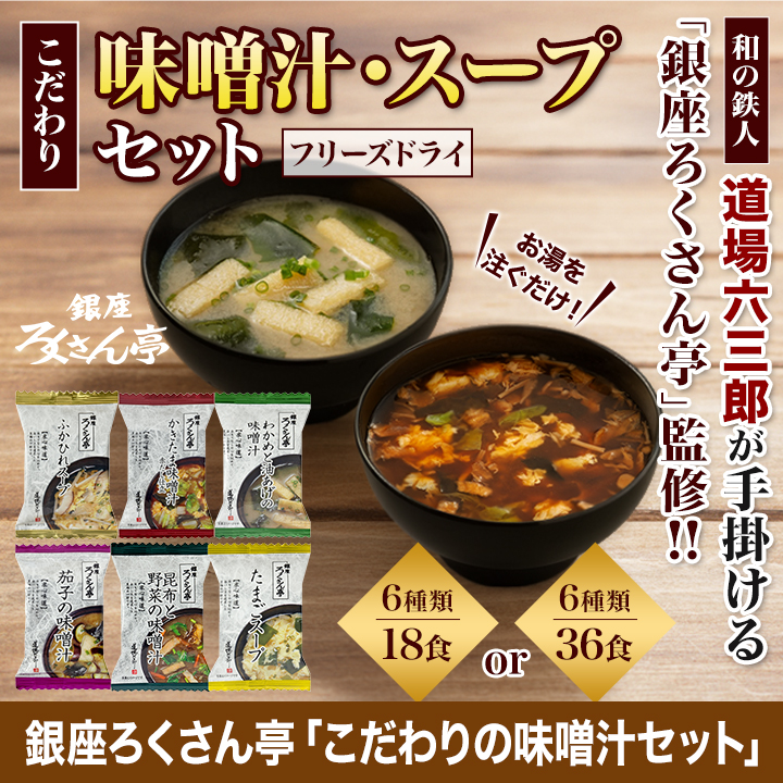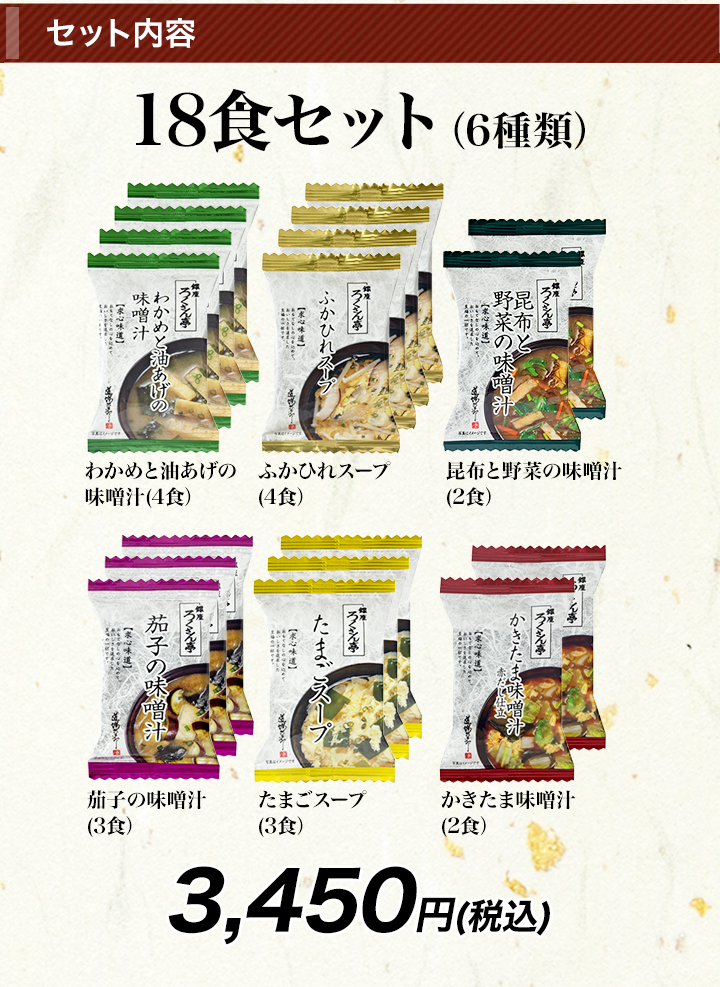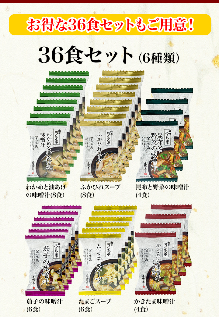 セット内容 | 【セット内容】 (1)6種18食 / (2)6種36食 【種類(6種)】 茄子の味噌汁 / かきたま味噌汁 / 昆布と野菜の味噌汁 / わかめと油揚げの味噌汁 / たまごスープ / ふかひれスープ |
