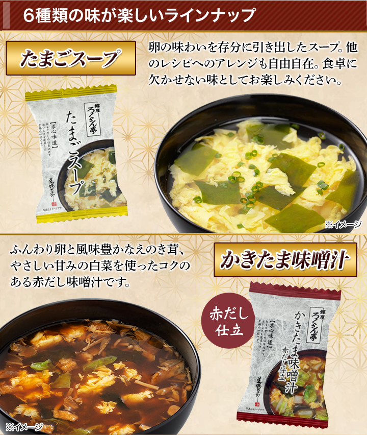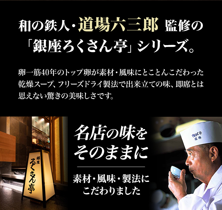 商品説明 | 和の鉄人・道場六三郎監修の「銀座ろくさん亭」シリーズ。 卵一筋40年のトップ卵が素材・風味にとことんこだわった乾燥スープ、フリーズドライ製法で出来立ての味、即席とは思えない驚きの美味しさです。 |