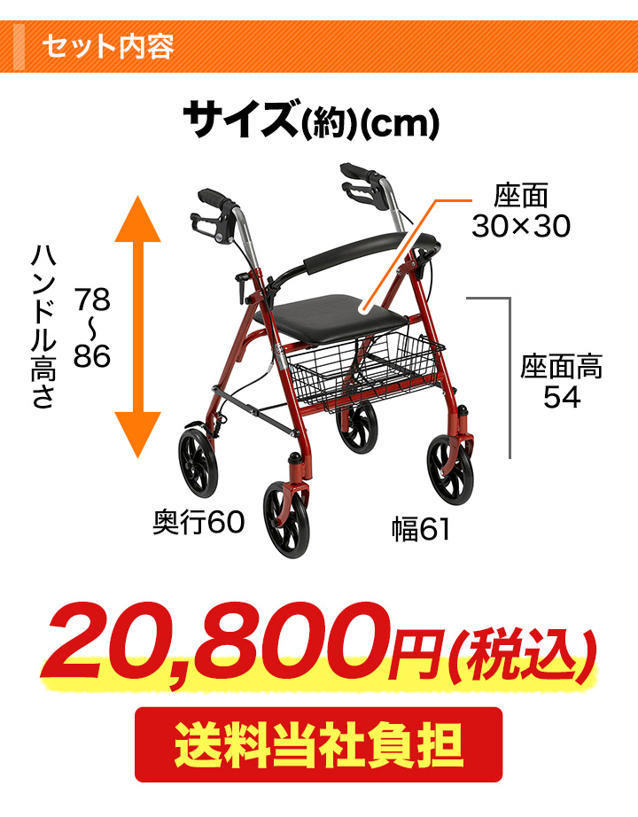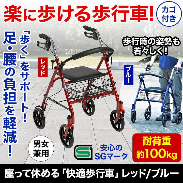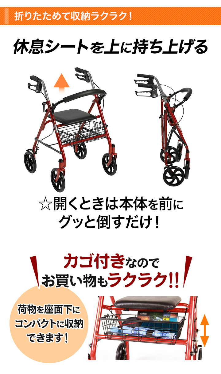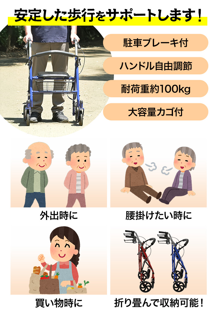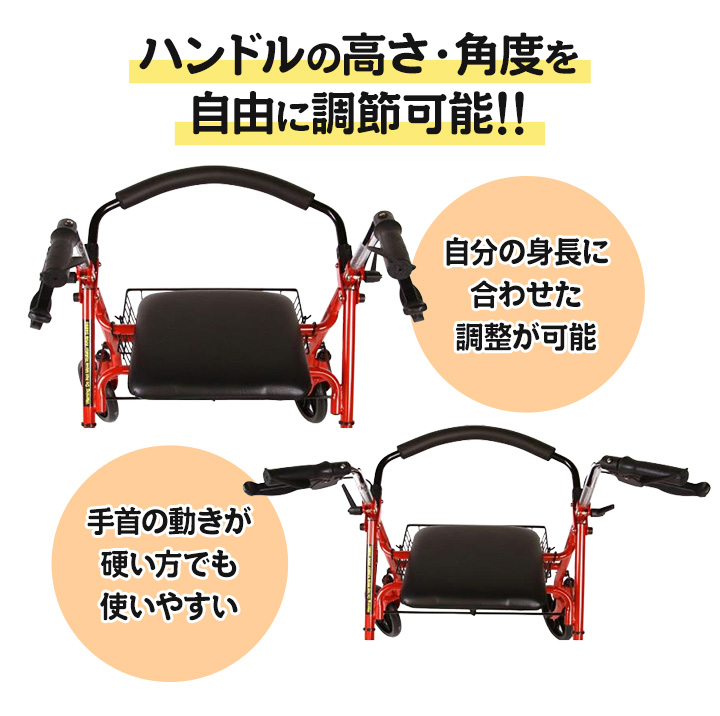 商品説明 | 「歩く」をサポートして、足・腰の負担を軽減!安心のSGマーク取得済み、座れる歩行車をご紹介♪ お買い物に便利なカゴ付、更に耐荷重約100kgの座れる座椅子まで! 使わない時はスマートに折り畳めて収納可能。 ハンドルの角度が自由に調整できるので、手首の動きが硬い方でも使いやすい仕様になっております。 |