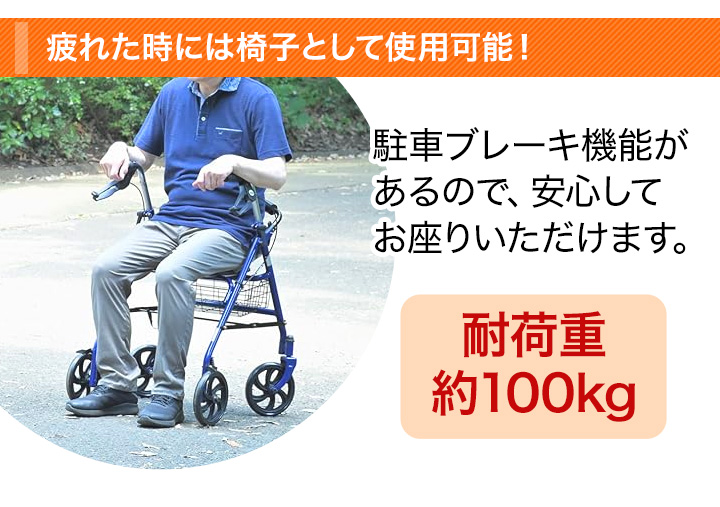 制限・注意事項 | ○最大使用者体重を越える方は使用しないでください。 ○坂道や傾斜のある場所で駐車をしない。 ○休息シートの上に立ったり、足をかけたりしない。 ○勢いをつけて段差を乗り越えたりしない。 ○歩行車を使用する際は両手で操作する。 ○複数の人数で使用しない。 |