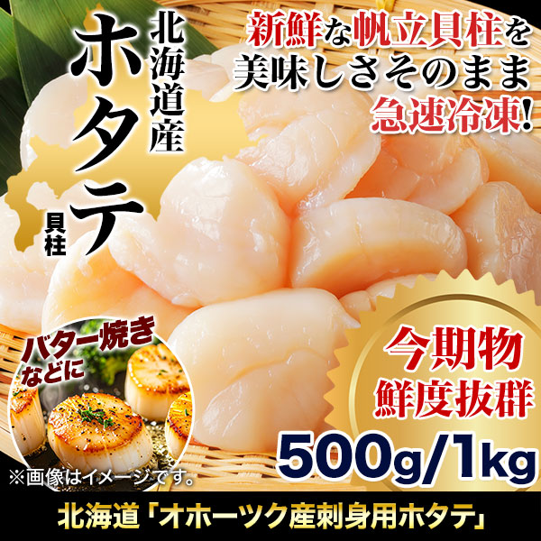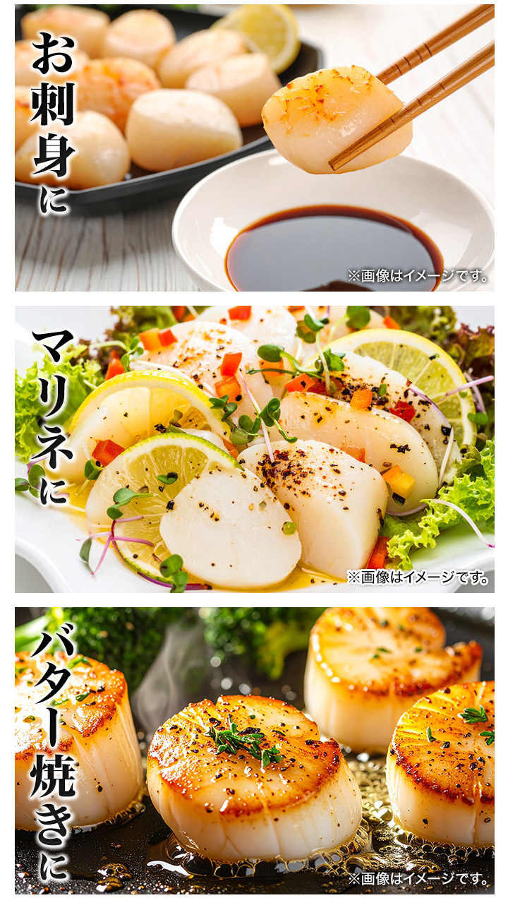 北海道産の刺身用ホタテ貝柱。急速冷凍で生のホタテの旨味を逃さず、そのまま食卓へお届け。バラ凍結で使いやすく、今期の新物なので鮮度も抜群!