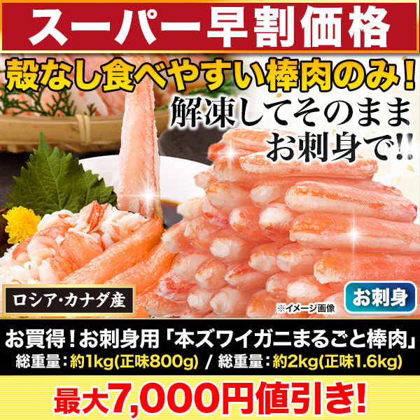 商品説明 | 可食部ほぼ100%!重たい肩肉や殻を含まず、 棒肉のお刺身のみをお届けします! お刺身用ならではのとろける食感とカニ本来の甘さが味わえます。 ポン酢・カニ酢などにつけてそのまま召し上がっても良し、 カニしゃぶや雑炊にもオールマイティーに使えます! カニの一番いいところを食べやすく殻剥きしていますので、 解凍してそのままお刺身として食べる事ができます。 ボイルのカニでは味わえないトロンとした甘いカニ肉を存分にお楽しみください! |