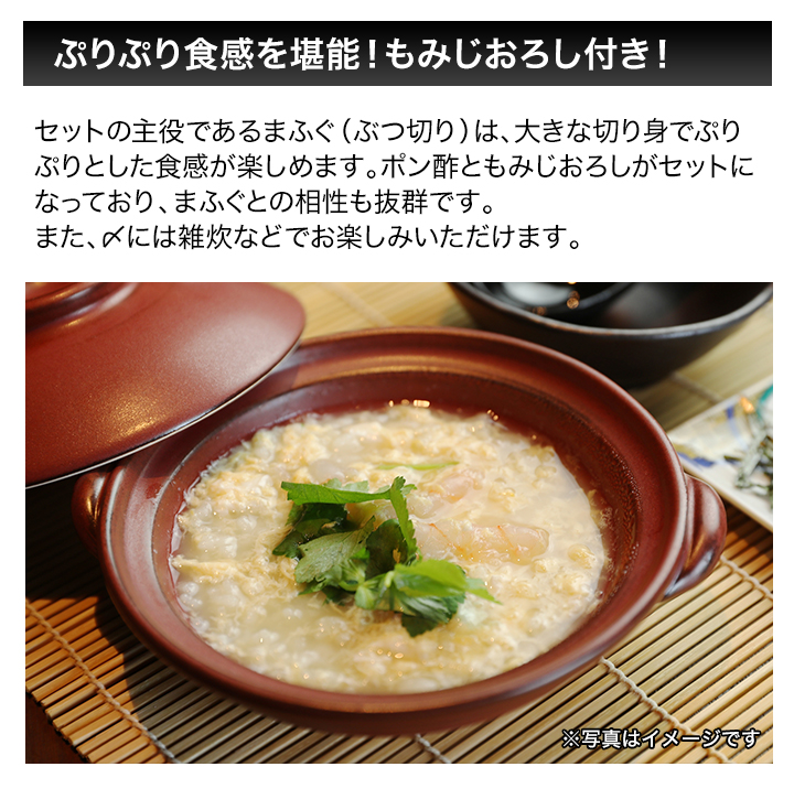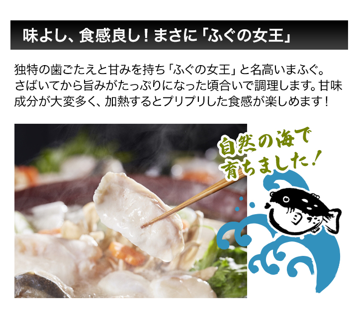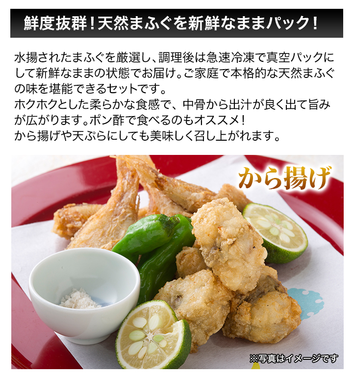 | 商品説明 | 山陰地方産の天然まふぐのみを使用した、「冬の味覚の王様」と呼ぶにふさわしい贅沢なセットです。 水揚げされたまふぐを厳選し、調理後は急速冷凍で真空パックにして新鮮なままの状態でお届けします。 切り身は大き目で、プリプリ食感の弾力と深い旨味が絶品です!身付アラは旨味を含んだ中骨に、美味しさが詰まっています。 付属の特製手作りポン酢、もみじおろしとご一緒にお召し上がりください。〆には雑炊などとしてもお楽しみいただけます。 |