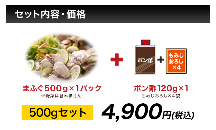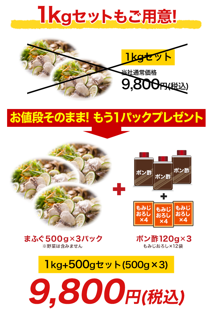 | セット内容 | 【1】500g(身付アラ、身)×1、ポン酢120g×1、もみじおろし×4袋 【2】1kg+500g(身付アラ、身)×3、ポン酢120g×3、もみじおろし×12袋 |