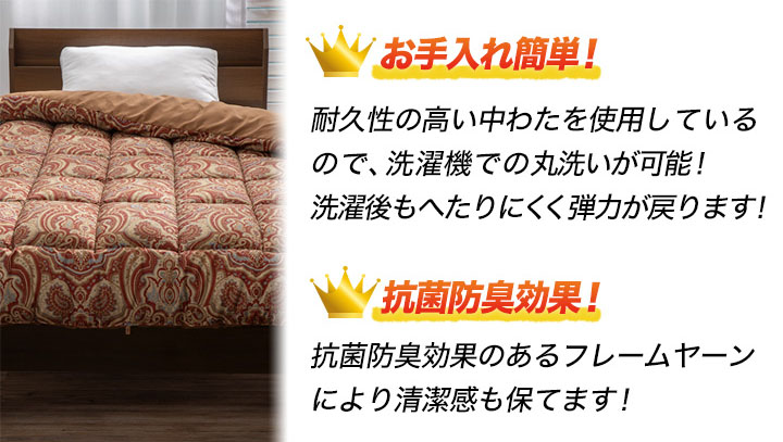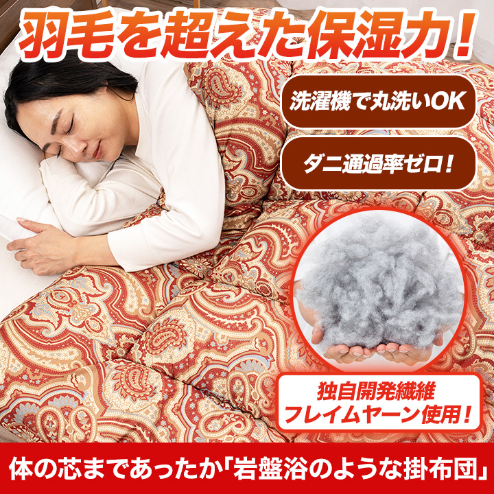 | 商品説明 | 羽毛を超えた保温力!体の芯まであったか!まるで岩盤浴のような掛布団です。 独自開発の天然鉱石配合繊維「FLAME YARN(フレイム ヤーン)」を使用。 同繊維を使用した生地と、使用していない生地との蓄熱試験の比較検証では、10分後に11.2℃もの温度差がみられました。 体が芯からあたたまり、寒い冬でも他の熱源を使わずに快適な睡眠を得ることができます。 蓄熱性に優れ岩盤浴にも使われている天然鉱石繊維と、高反発でへたりにくく耐久性に優れたダクロンΩ捲縮繊維を配合! 耐久性の高い中わたを使用しているので、洗濯機で丸洗いが可能! 洗濯後もへたりにくく弾力が戻ります! |