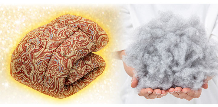 蓄熱性に優れ岩盤浴にも使われている天然鉱石繊維と、高反発でへたりにくく耐久性に優れたダクロンΩ捲縮繊維を配合!