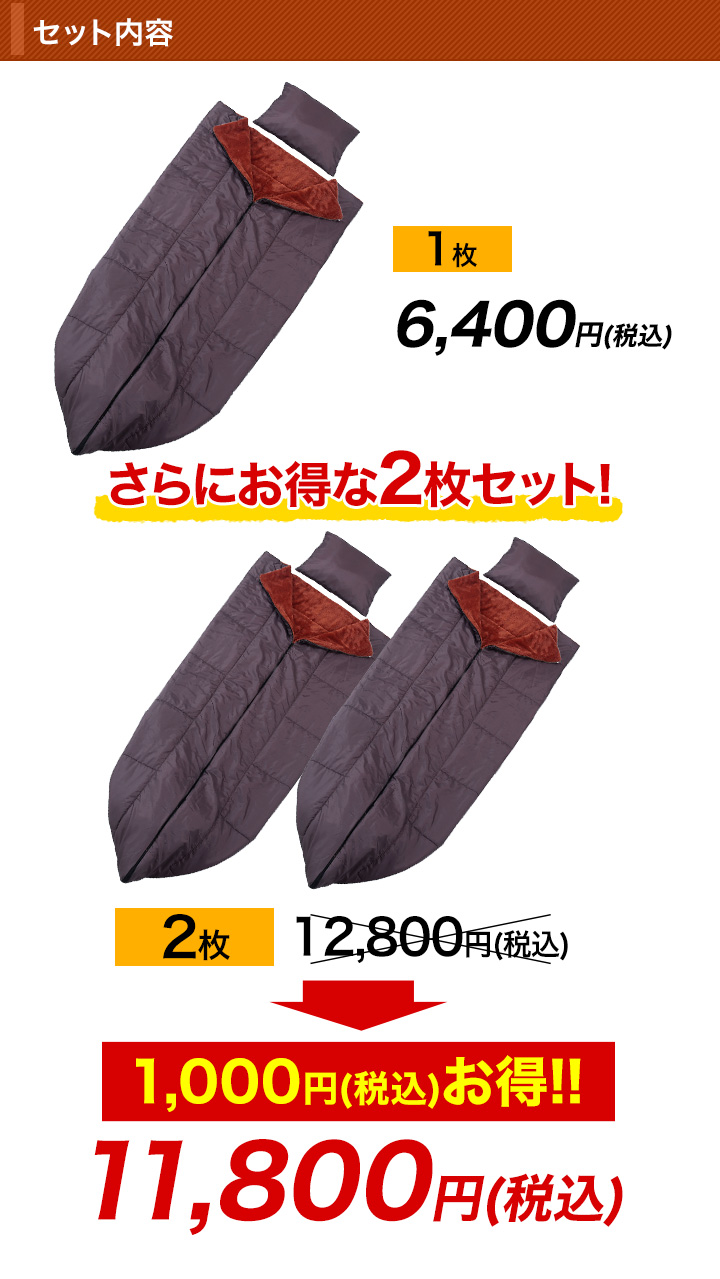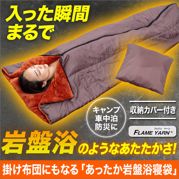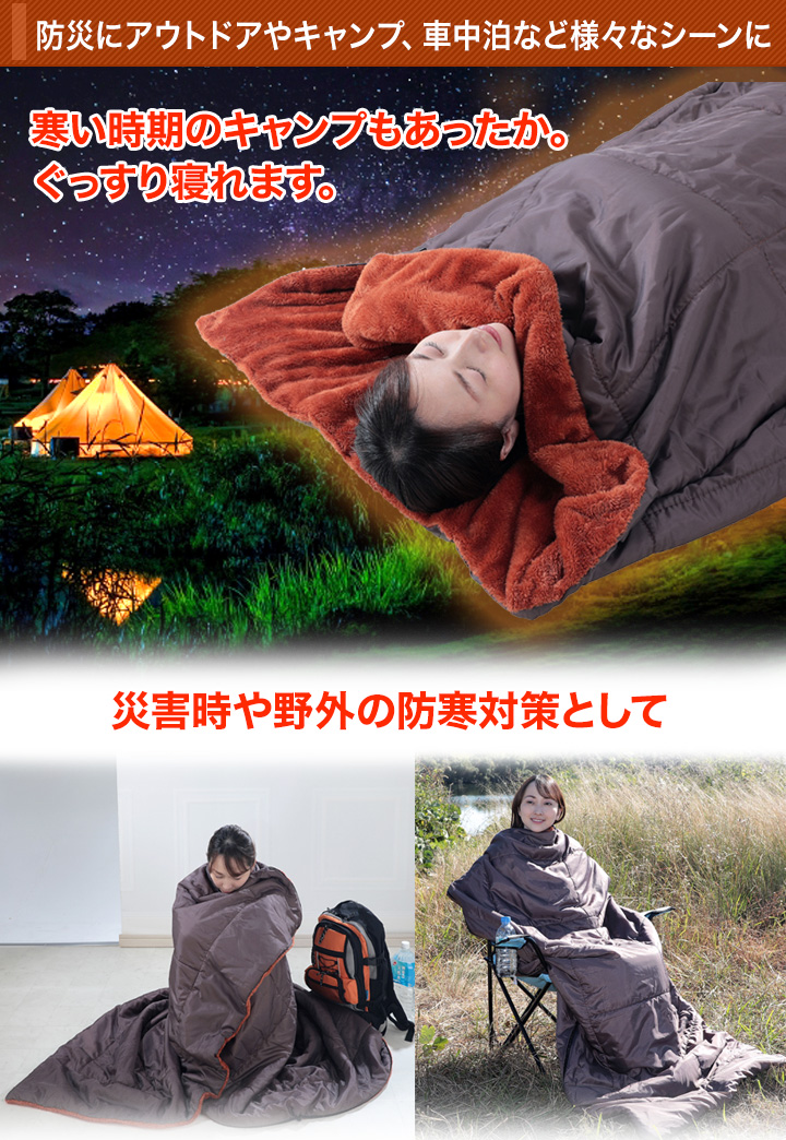 | 商品説明 | 羽毛を超える保温力!体の芯まであったか。 まるで岩盤浴のような寝袋。 防災用にもアウトドアやキャンプ、車中泊にも! いろいろなシーンで役立ちます。 寝袋としての使用だけでなく掛け布団や着る毛布としても使えます。 収納袋に畳んで入れるとクッション代わりに。 |