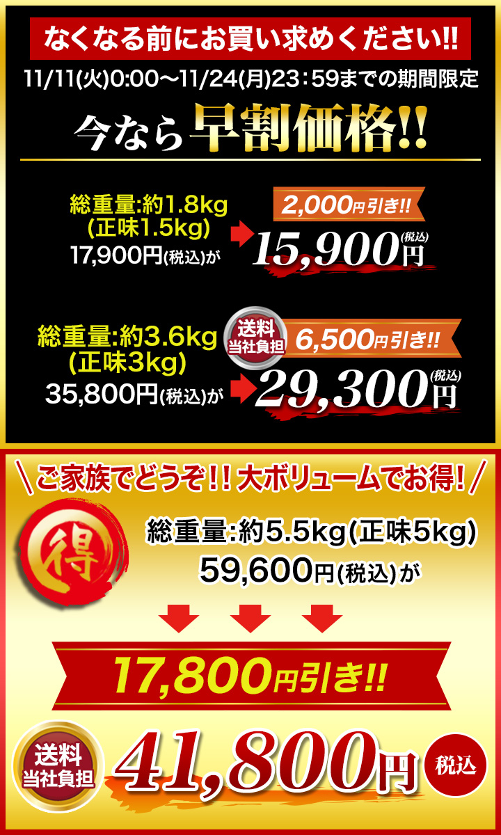 【早割価格】超特大特選ボイルズワイガニ肩付き脚 総重量:約1.8kg(正味:1.5kg)/総重量:約3.6kg(正味:3kg)/総重量:約5.5kg(正味:5kg)