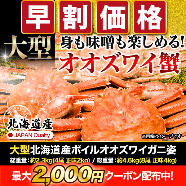 | セット内容 | オオズワイガニ 1尾サイズ:約450-600g前後 総重量:約2.3kg(4尾 正味2kg) 総重量:約4.6kg(8尾 正味4kg) ※総重量でのお届けとなる為、尾数は目安となります。 ※折れ脚、足し脚が混ざります。 |